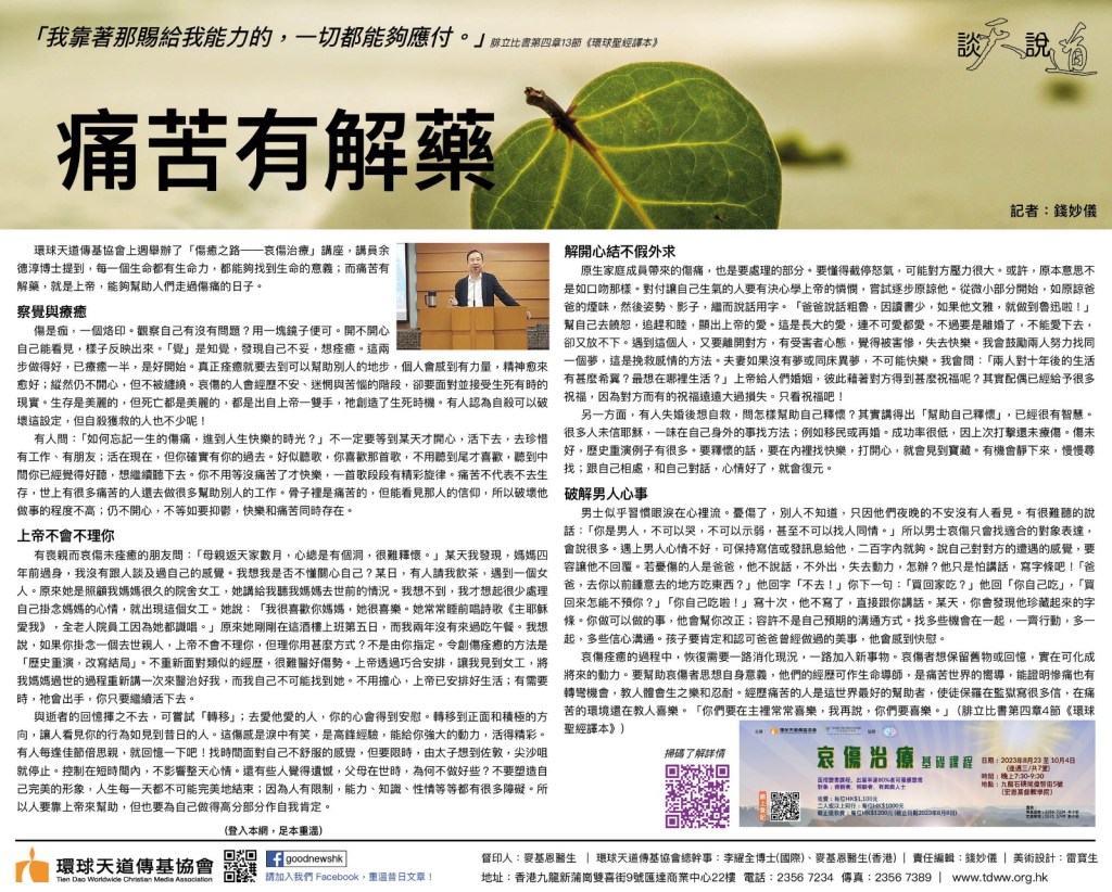 環球天道傳基協會上週舉辦了「傷癒之路──哀傷治療」講座,講員余德淳博士提到,每一個生命都有生命力,都能夠找到生命的意義;而痛苦有解藥,就是上帝,能夠幫助人們走過傷痛的日子。