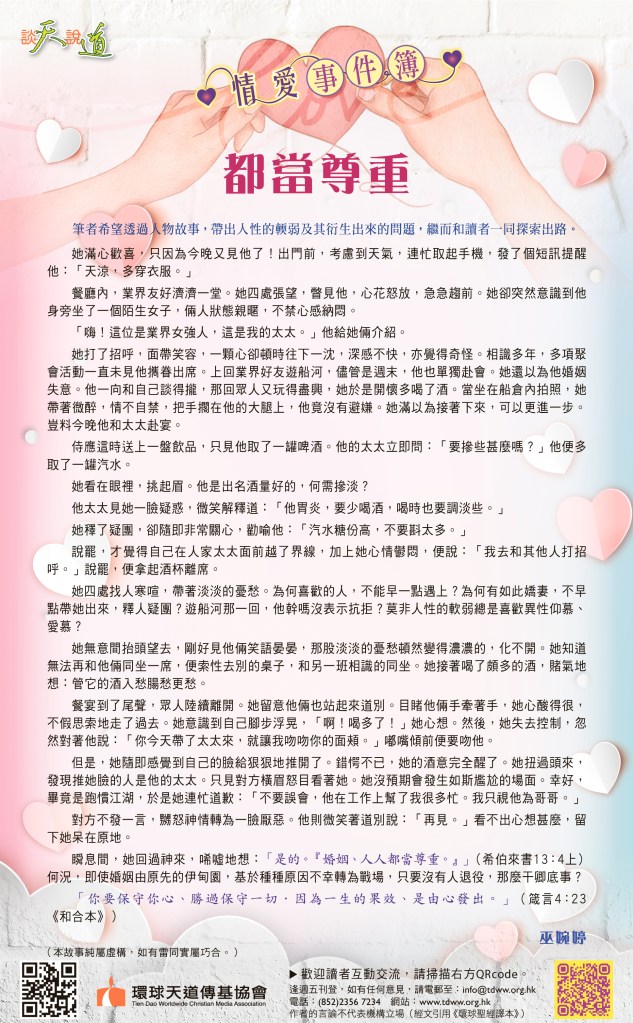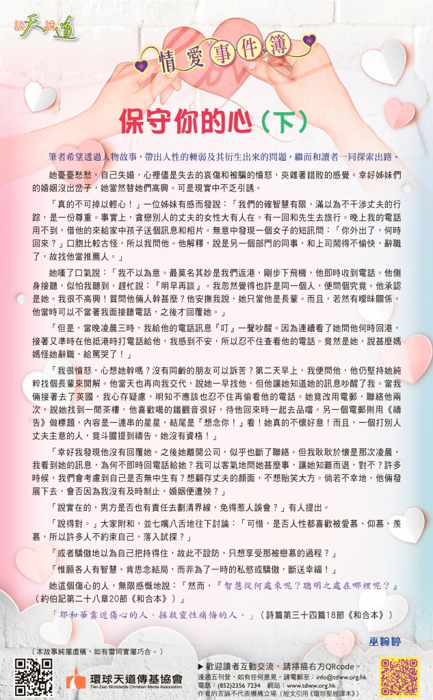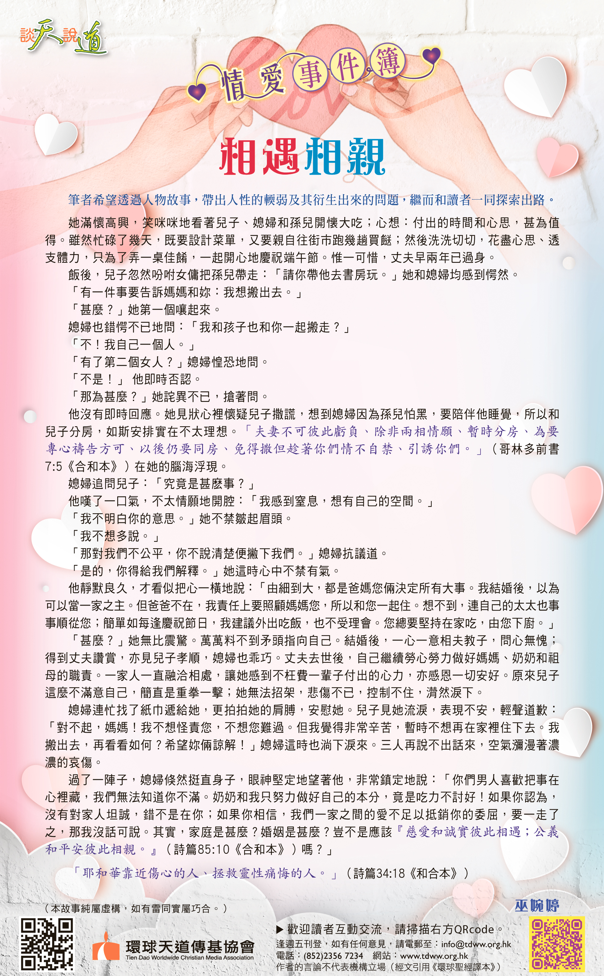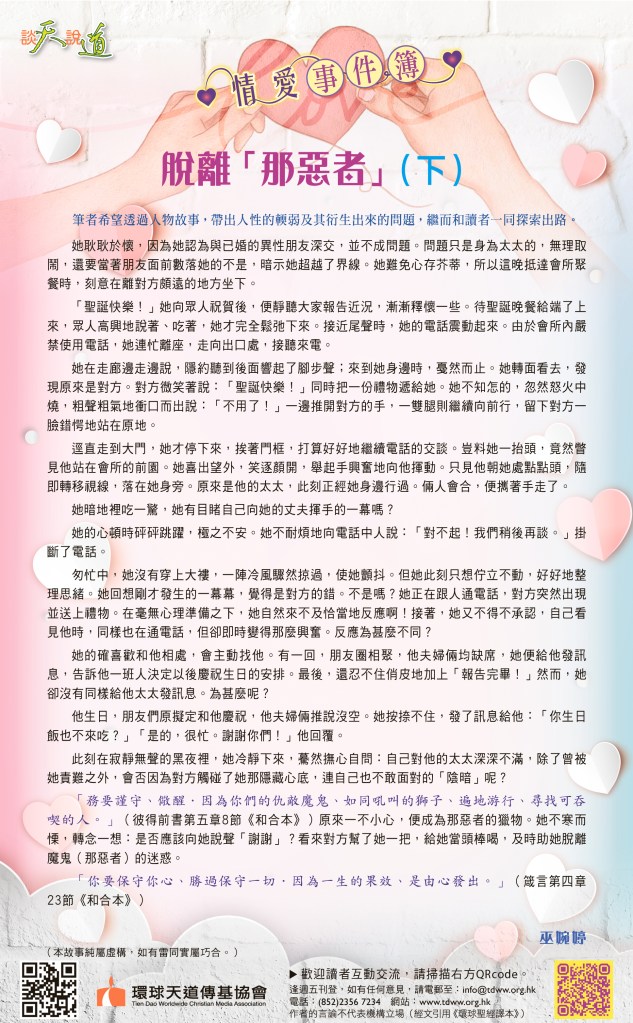是否當日太過輕易原諒他,更沒有共同深究並處理問題,才釀成他邁入老年,竟再來一趟婚外情;抑或是他骨子𥚃,根本是個自私、貪心的人?不管怎樣,這回,她得抽身而退了!她踱步回床邊,繼續收拾衣物。忽然,開門聲響起,只見丈夫──她以為是天賜的禮物,走進來。他有點氣急敗壞,卻仍故作鎮定地説:「是網上認識的,都是胡謅鬧著玩的。」她望著他,心想:「要聽他解釋嗎?可以相信他嗎?雖然愛是『凡事包容、凡事相信、凡事盼望、凡事忍耐。』(哥林多前書13:7)《和合本》」