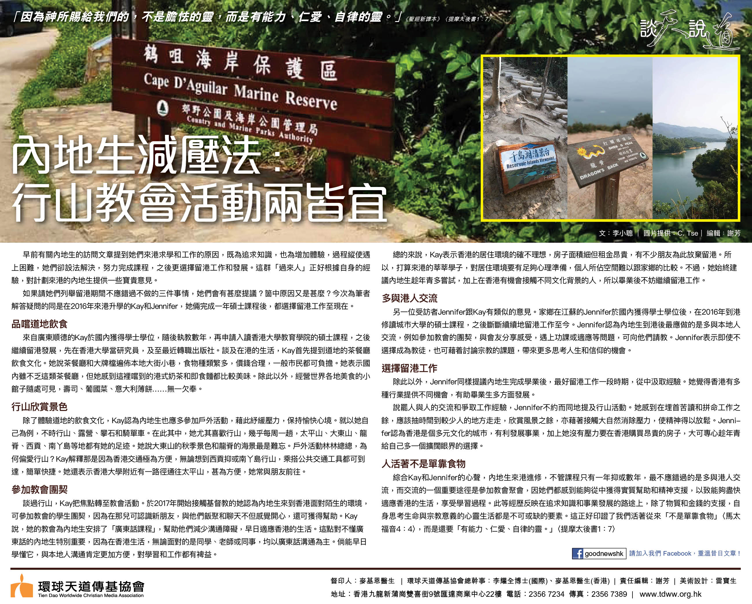 綜合Kay和Jennifer的心聲,內地生來港進修,不管課程只有一年抑或數年,最不應錯過的是多與港人交流,而交流的一個重要途徑是參加教會聚會,因她們都感到能夠從中獲得實質幫助和精神支援,以致能夠盡快適應香港的生活,享受學習過程。此等經歷反映在追求知識和事業發展的路途上,除了物質和金錢的支援,自身思考生命與宗教意義的心靈生活都是不可或缺的要素。這正好印證了我們活著從來「不是單靠食物」〈馬太福音4:4〉,而是還要「有能力、仁愛、自律的靈。」〈提摩太後書1:7〉