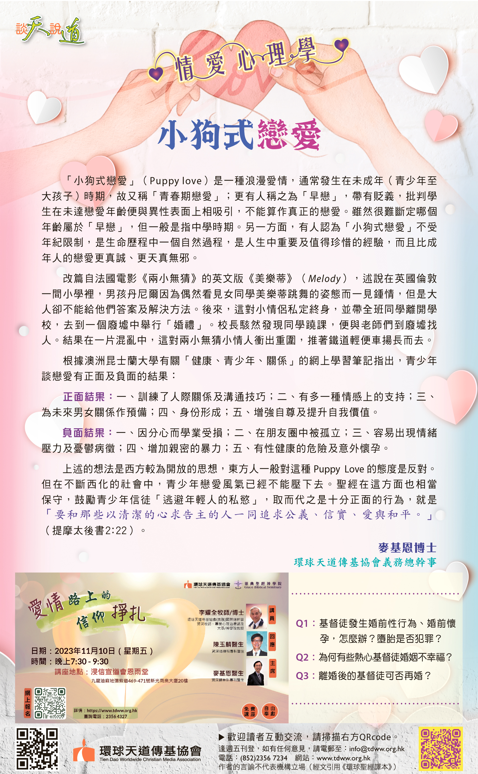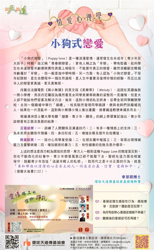 上述的想法是西方較為開放的思想,東方人一般對這種Puppy Love的態度是反對。但在不斷西化的社會中,青少年戀愛風氣已經不能壓下去。聖經在這方面也相當保守,鼓勵青少年信徒「逃避年輕人的私慾」,取而代之是十分正面的行為,就是「要和那些以清潔的心求告主的人一同追求公義、信實、愛與和平。」(提摩太後書2:22)。