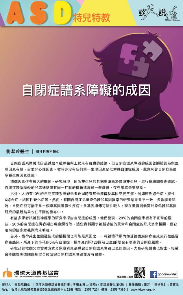 自閉症譜系障礙成因是甚麼?雖然醫學上仍未有確實的結論,但自閉症譜系障礙的成因普遍被認為與生理因素有關,而並非心理因素。暫時亦沒有任何單一生理因素足以解釋自閉症成因,此意味著自閉症是由多種生理因素造成。