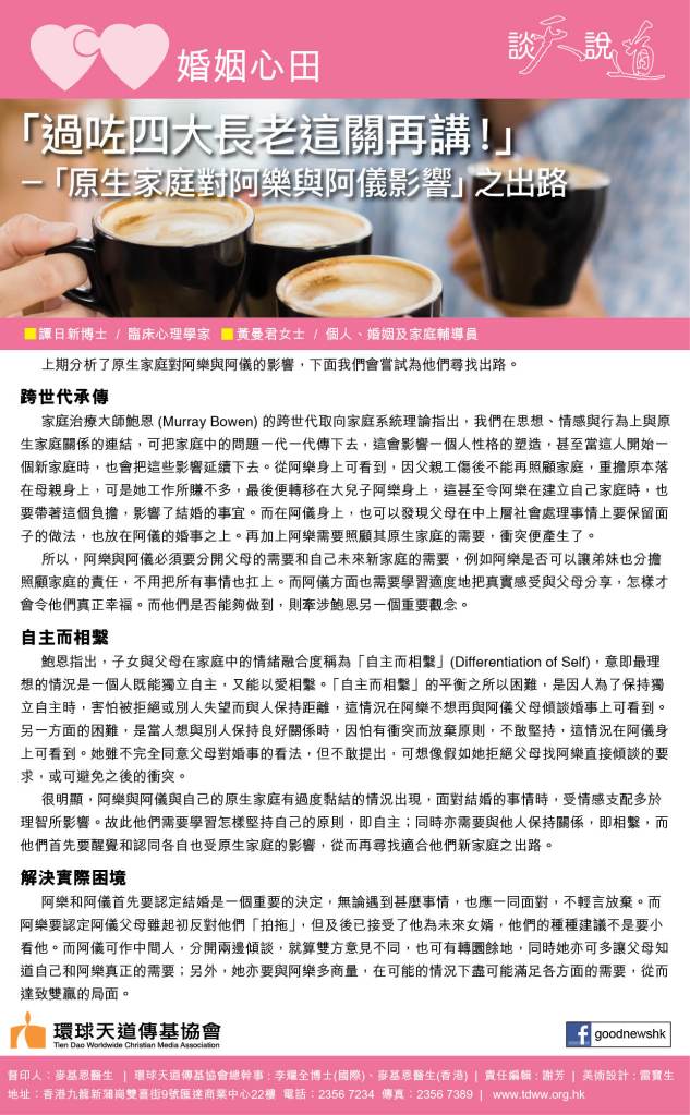 阿樂和阿儀首先要認定結婚是一個重要的決定,無論遇到甚麼事情,也應一同面對,不輕言放棄。而阿樂要認定阿儀父母雖起初反對他們「拍拖」,但及後已接受了他為未來女婿,他們的種種建議不是要小看他。而阿儀可作中間人,分開兩邊傾談,就算雙方意見不同,也可有轉圜餘地,同時她亦可多讓父母知道自己和阿樂真正的需要;另外,她亦要與阿樂多商量,在可能的情況下盡可能滿足各方面的需要,從而達致雙贏的局面。