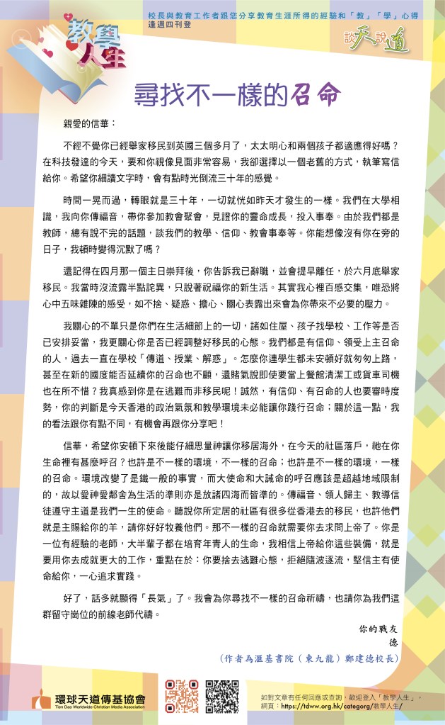 「人心計劃自己的道路,耶和華決定他的腳步。」(箴言16章9節)神的計劃遠超過我們所想。大約兩年前,我在家裡收拾物品的時候,發現幼稚園畢業冊內「我的志願」那一頁,畫了一個戴著護士帽的女孩。原來神早在我兒時已將這顆種子栽種在我的心田,直至十多年後,終於發芽、生長、開花並結果。期望我自己能成為更多人的祝福,也希望這見證能成為你的祝福。雖然我不知前路如何走,只願順服神所託付給我的召命。