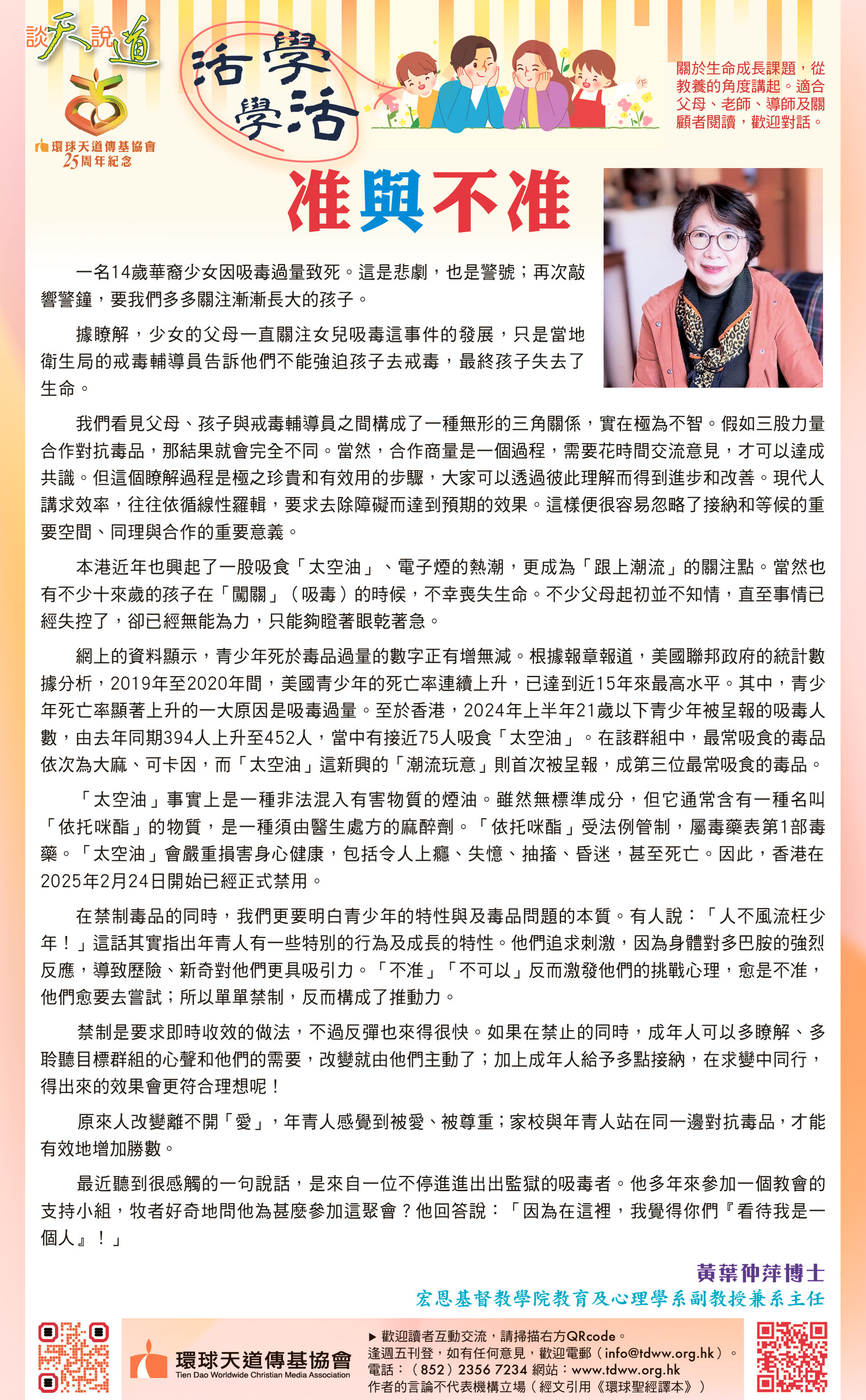 禁制是要求即時收效的做法,不過反彈也來得很快。如果在禁止的同時,成年人可以多瞭解、多聆聽目標群組的心聲和他們的需要,改變就由他們主動了;加上成年人給予多點接納,在求變中同行,得出來的效果會更符合理想呢!