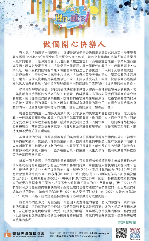其實理性的分析,甚至基督教傳統的美德帶來的喜樂都可歸究於體內的分泌。神經生理學的研究顯示,無論是以理性為主的大腦,以感性為主的中腦及以生存為主的下腦都可以在刺激下產生影響快樂指數的分泌,也是說不只是理性,感性及求生的活動(如飲食),其實都可帶來快感。還有,一些外在的因素,如運動、人生大事等,也可刺激體內多巴胺等的分泌而帶來快感。