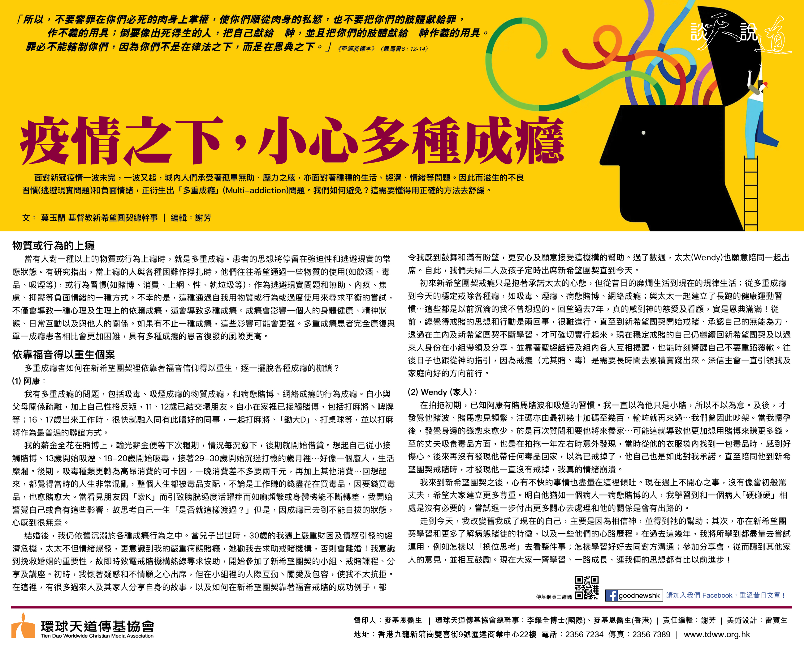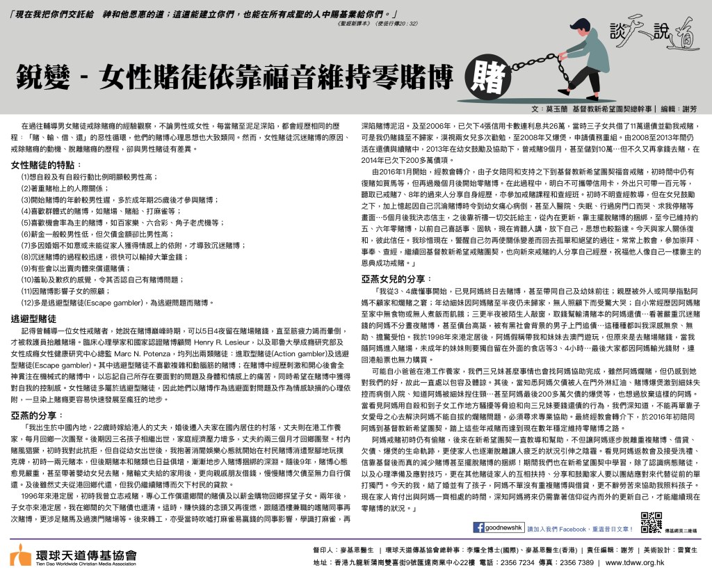 新希望團契總幹事莫玉蘭分享過去三年雖然受著社會運動和疫情的影響,福音戒賭的服侍亦從全面的實體轉變為大部分以網上形式進行。這種新的嘗試原來也能有效地幫助賭徒戒賭,戒賭服侍也因此可以伸延到世界不同角落,上年已開展了網上服侍國內的戒賭家庭。 莫玉蘭總幹事指出病態賭徒是「單條獨賭」,而他們身邊的家人則是「單打獨鬥」。病態賭徒和他們的家人長期處於獨自面對和處理賭博所帶來個人和整個家庭的影響,雙方都發展出一些惡性循環,「身心社靈」都受到破損,所以戒賭是全人關懷「身心社靈」的重整。透過全人關懷醫治「身心社靈」的概念,將一個人視為一個整體而非人的某一部份,承認一個人的生理、社會、心理和靈性方面是互相依存的,而成癮卻破壞一個人的「身心社靈」,透過全人關懷醫治重整成癮者的「身心社靈」,他們整體生命經歷更新轉變,再不需要像從前依附在過往的成癮行為或物質上,這樣才真正可以達致長久「脫癮」。 基督教新希望團契透過以下的運作模式,包括:戒賭聚會、查經班、戒賭課程、賭徒家人課程、戒賭者及過來人互助組、家人互助組、信仰小組、戒賭同行者門訓、事奉培訓等;加上個人輔導、債務輔導、情緒講座、戒賭及預防復賭講座;還配合癒後服務,透過義務工作、康樂 活動、旅行、家庭營、營會、聚餐等,幫助賭徒建立有益身心的無賭健康生活,同時促進與家人建立和諧的家庭關係。讓戒賭者和他們的家人獲得更全面的支援,並在『身、心、社、靈』上重新學習及轉變,達致全人改變。運作上,分別在港島、九龍東及九龍西與教會合作,建立四個戒賭網絡,外展社區,進入人群,實踐主所吩咐的大使命和大誡命,擴展主的愛和醫治。
