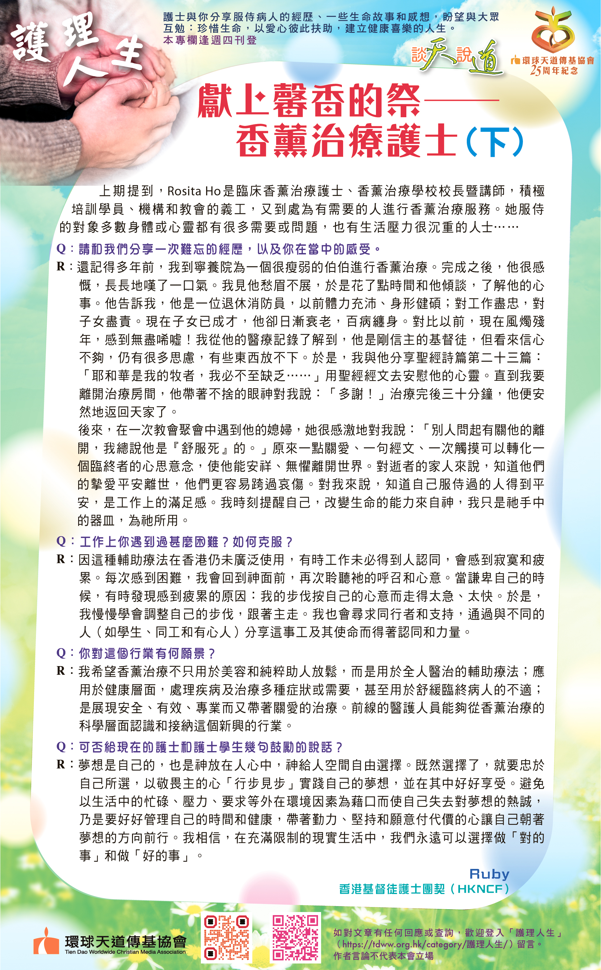 求診物理治療價值不菲,特別不是光顧三、兩次就可以解決的事,而是需要維持一段長時間求診和復康;所以我請教我的保險經紀,是否可以申請索償?對方表示我可以向普通科醫生求診,請醫生為我寫轉介信到物理治療部,並須在轉介信上標明是「意外」受傷;我當時的頸患已有半年時間,需要另外寫信解釋是否因為疫情而延遲求醫等等。我越細緻地得知如何能成功索償,心裡就越感到不平安。縱然可能有人成功申請索償,但我的腦海響起路加福音第十六章10節主耶穌的教導:「在極少的事上忠心的,在許多事上也忠心;在極少的事上不義的,在許多事上也不義。」我們且相信主的供應,就在主的應許之中生活吧!最後,我放棄了申請索償。