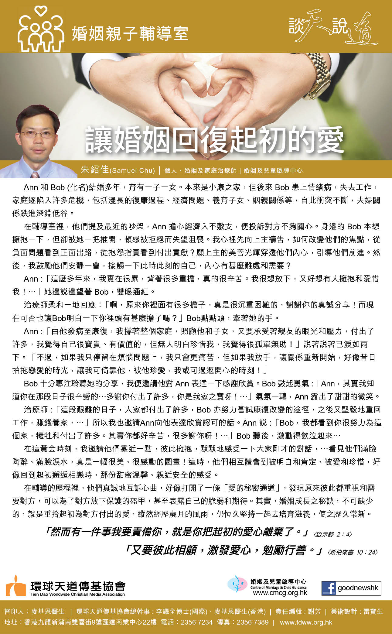 Ann和Bob (化名)結婚多年,育有一子一女。本來是小康之家,但後來Bob患上情緒病,失去工作,家庭逐陷入許多危機,包括漫長的復康過程、經濟問題、養育子女、姻親關係等,自此衝突不斷,夫婦關係跌進深淵低谷。