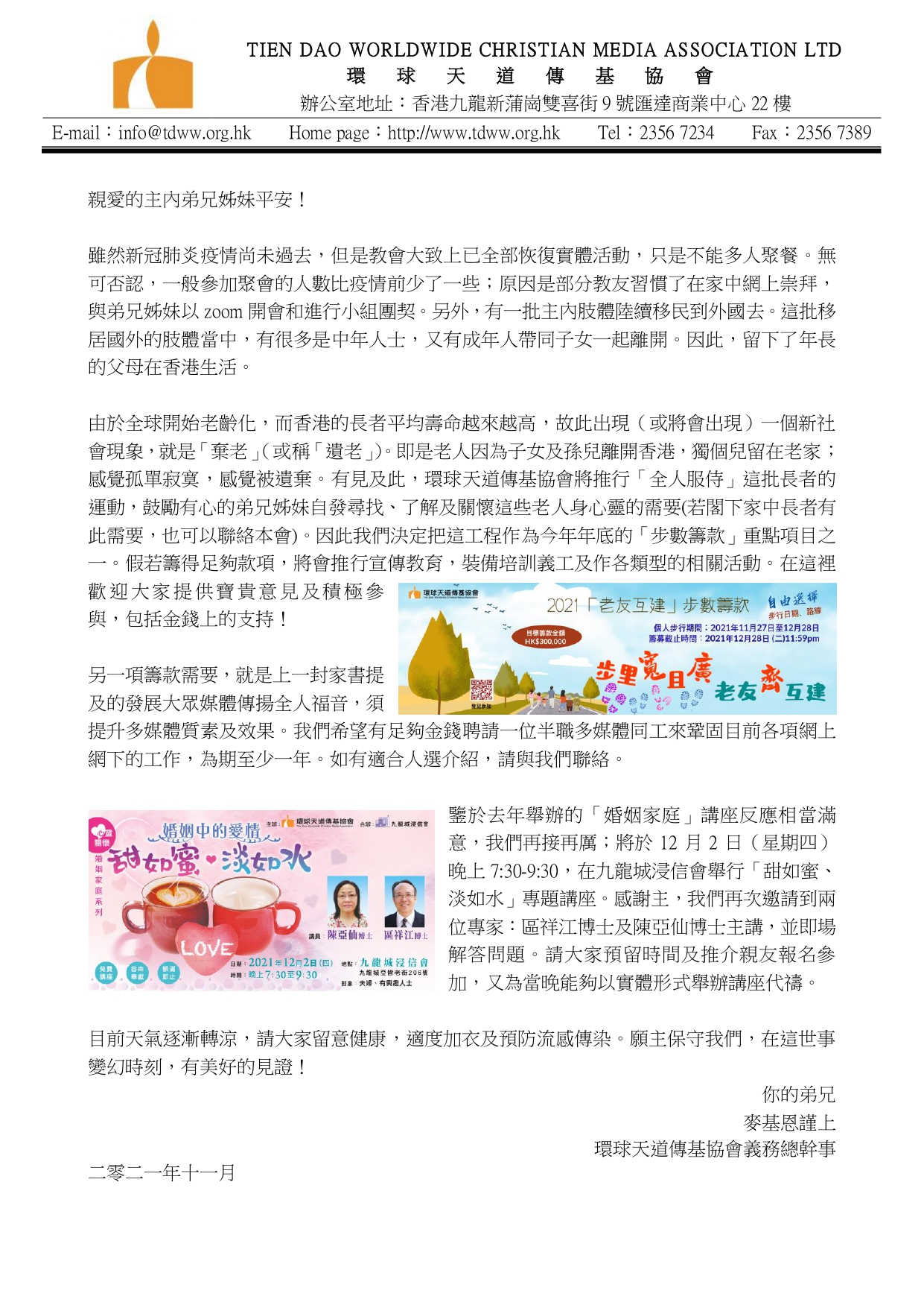 在未來的日子,我們要付上為數不少(合理增加)的辦公室服務費,並且計劃增添半位至一位同工來協助發展福音工作。因此,懇請大家能進一步奉獻支持我們。在這裡,我特別邀請大家積極參加在12月14日(星期六)舉辦的2024慈善步行籌款活動「家家樂同行」。當天下午三時在灣仔海濱長廊起步,步行至中區;途中會介紹兒童、家庭、長者,與人生三大階段有關的全人健康趣味資訊。假若大家能抽空出席,請盡早與本會聯絡,報名參加(須使用按政府要求申請步行籌款有編號的表格);亦可以純粹奉獻給是次步行籌款活動。