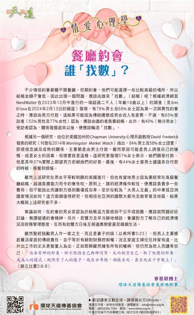 不少情侶約會都離不開餐廳。初期約會,他們可能選擇一些比較高級的場所,所以結帳金額不會低。因此出現一個問題,應該由誰來「找數」(結帳)呢?根據經濟網頁NerdWallet在2023年12月中進行的一項超過二千人(年齡18歲以上)的調查(見Erin El Issa在2024年2月13日的報道)發現,有78%男士及68%女士認為第一次與異性約會之時,應該由男方付款。這結果可能因為傳統禮貌或男女收入有差異。不過,有65%受訪者(52%男性及77%女性)認為,應該由邀約者負責結帳。此外,有40%(無分男女)受訪者認為,關係發展起來以後,便應該輪流「找數」。