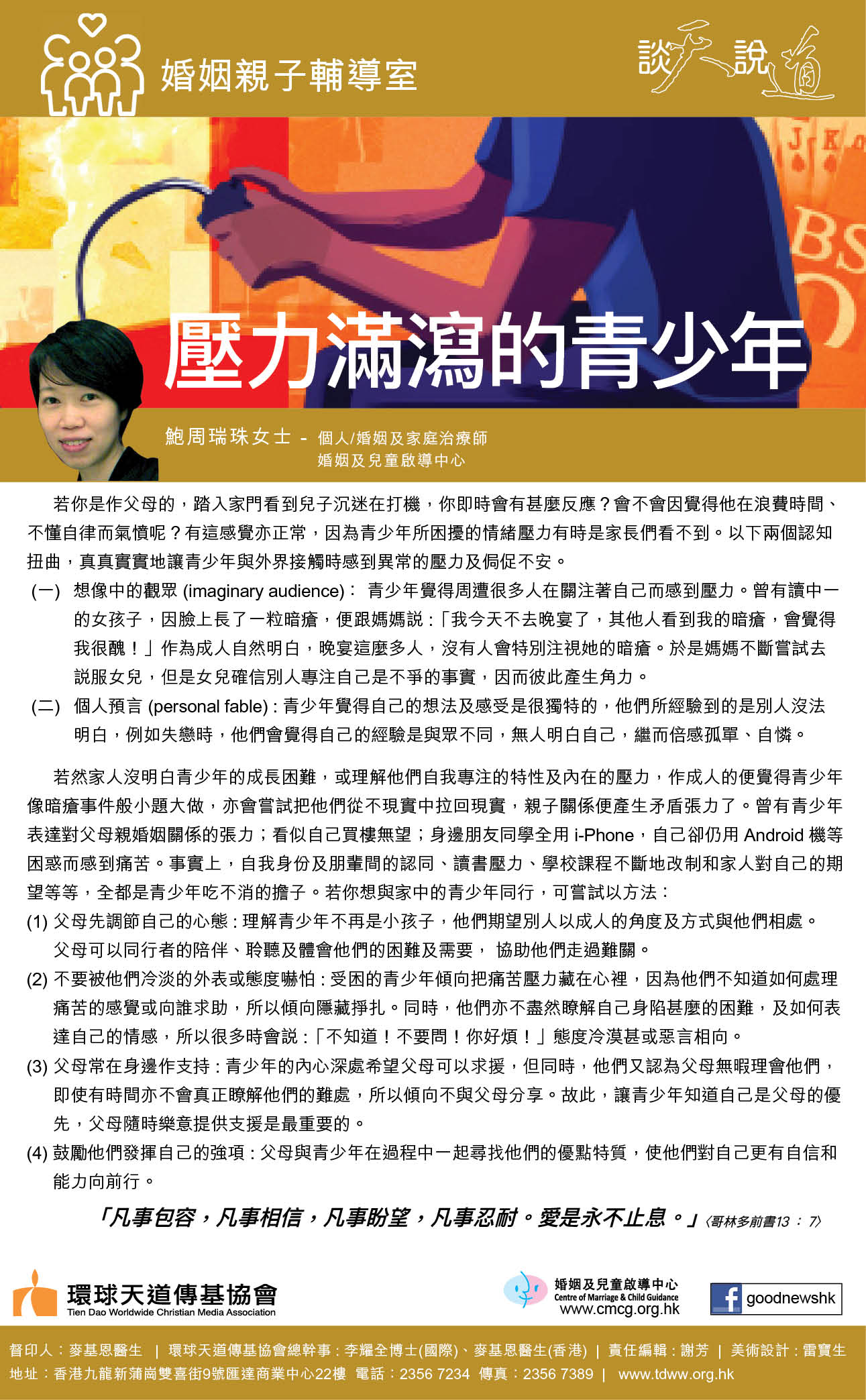 若然家人沒明白青少年的成長困難,或理解他們自我專注的特性及內在的壓力,作成人的便覺得青少年像暗瘡事件般小題大做,亦會嘗試把他們從不現實中拉回現實,親子關係便產生矛盾張力了。曾有青少年表達對父母親婚姻關係的張力;看似自己買樓無望;身邊朋友同學全用I-phone,自己卻仍用android 機等困惑而感到痛苦。事實上,自我身份及朋輩間的認同、讀書壓力、學校課程不斷地改制和家人對自己的期望等等,全都是青少年吃不消的擔子。若你想與家中的青少年同行,可嘗試以方法﹕