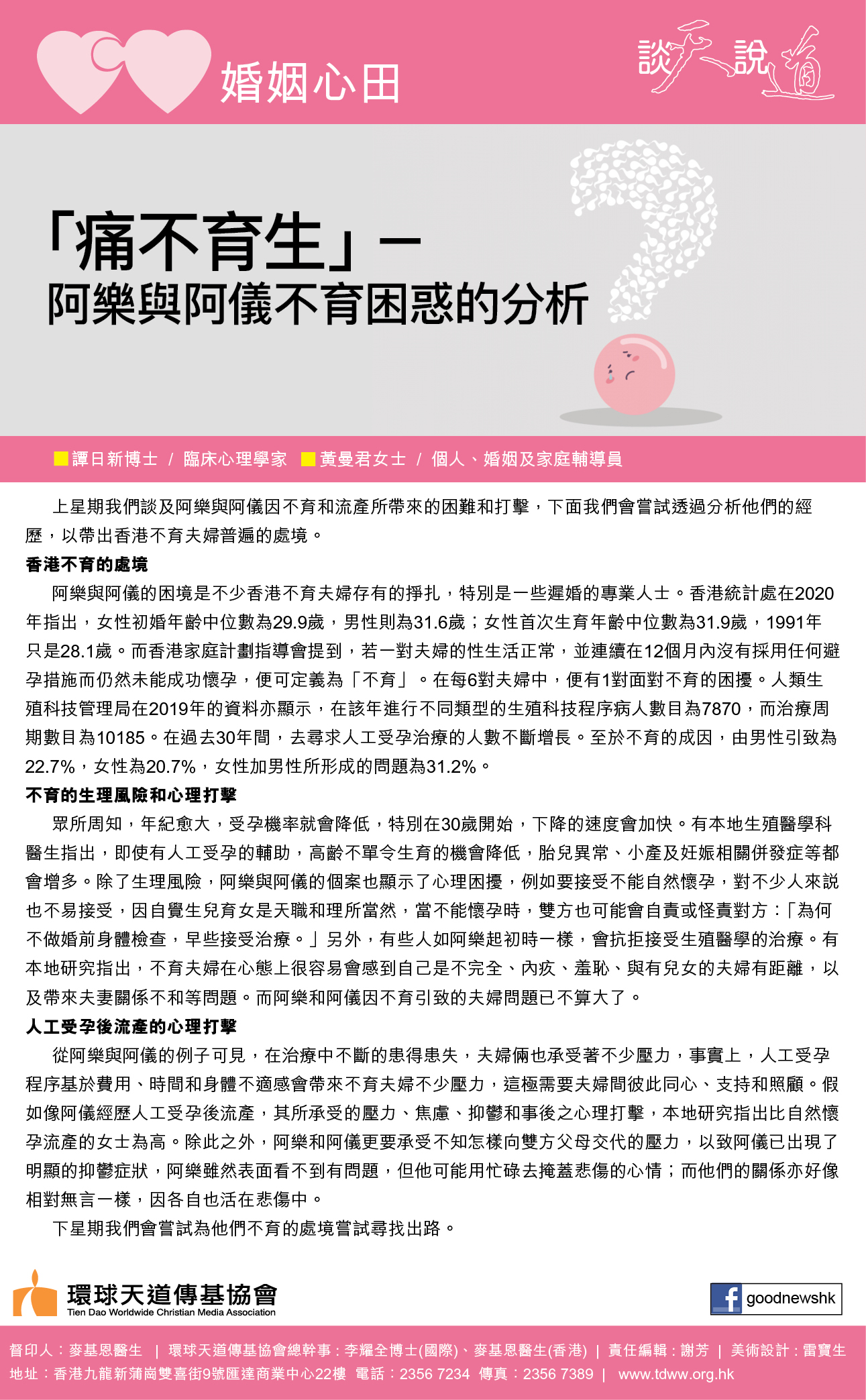 上星期我們談及阿樂與阿儀因不育和流產所帶來的困難和打擊,下面我們會嘗試透過分析他們的經歷,以帶出香港不育夫婦普遍的處境。