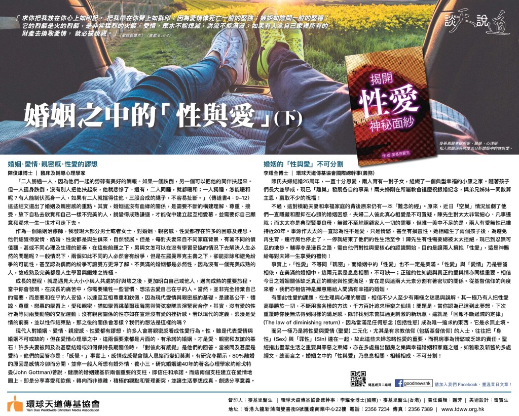 事實上,「性愛」不等同「親密」,而婚姻中的「性愛」也不一定是美滿。「性愛」與「愛情」乃是唇齒相依,在美滿的婚姻中,這兩元素是息息相關,不可缺一;正確的性知識與真正的愛與情亦同樣重要。相信今日之婚姻關係缺乏真正的親密與性愛滿足,實在是與這兩大元素分割有著密切的關係。從基督信仰的角度來看,我們亦相信神是願意賜給人間滿有幸福的婚姻。