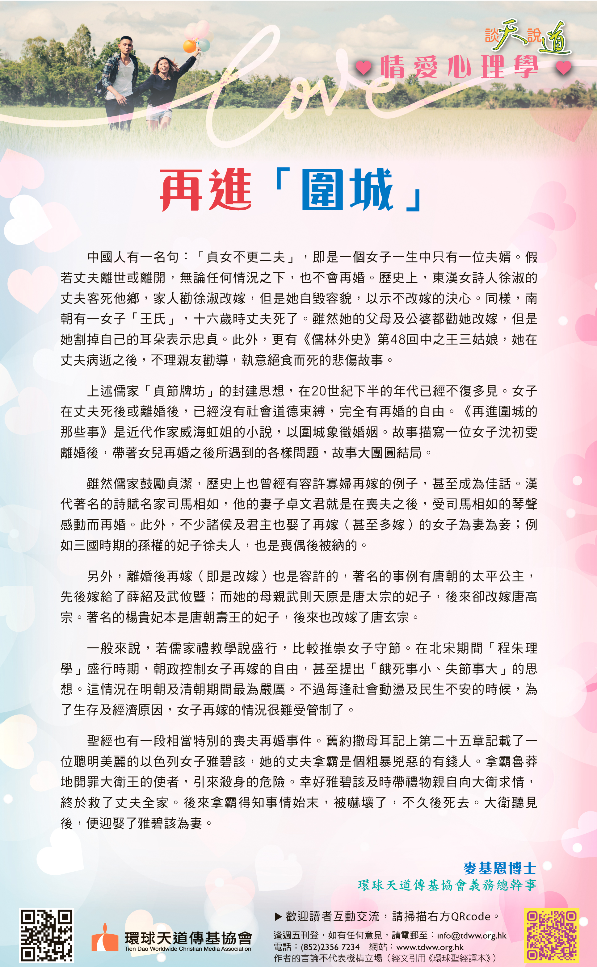 「二人勝過一人,因為他們一起的勞碌有美好的酬報。如果一個跌倒,另一個可以把他的同伴扶起來。但一人孤身跌倒,沒有別人把他扶起來,他就悲慘了。還有,二人同睡,就都暖和;一人獨睡,怎能暖和呢?有人能制伏孤身一人,如果有二人就擋得住他。三股合成的繩子,不容易扯斷。」〈傳道書4﹕9-12〉這些經文道出了婚姻及親密感的重點。其實,婚姻這沒有血緣的關係,是需要不斷的構建理解、尊重、接受,放下自私去欣賞和自己一樣不完美的人,銳變得成熟謙遜,才能從中建立起互相愛慕,並需要你自己願意和渴求一生一世才可走下去。