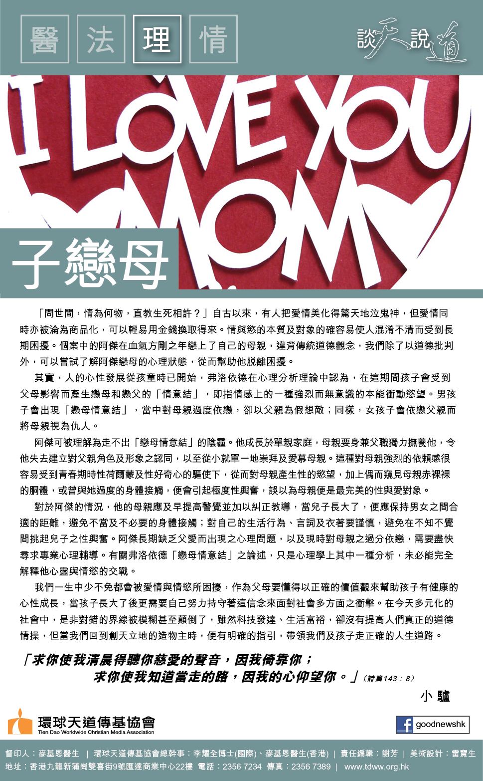 阿傑的父母在他兩歲時離異,父親搬了出去後,他與媽媽(單親母親)相依為命。十數年來,阿傑得到媽媽的悉心養育,所以心存感激,母子關係甚好。只是當他踏進青春期時,對性好奇漸增,對女性也開始有幻想;加上在家母子兩人相處和接觸時缺乏清楚的男女界線,令阿傑由愛慕母親的心增加了一些非分之想,因此產生了疑似戀母的情意結。當他向媽媽示愛時,才令張太驀然驚醒!