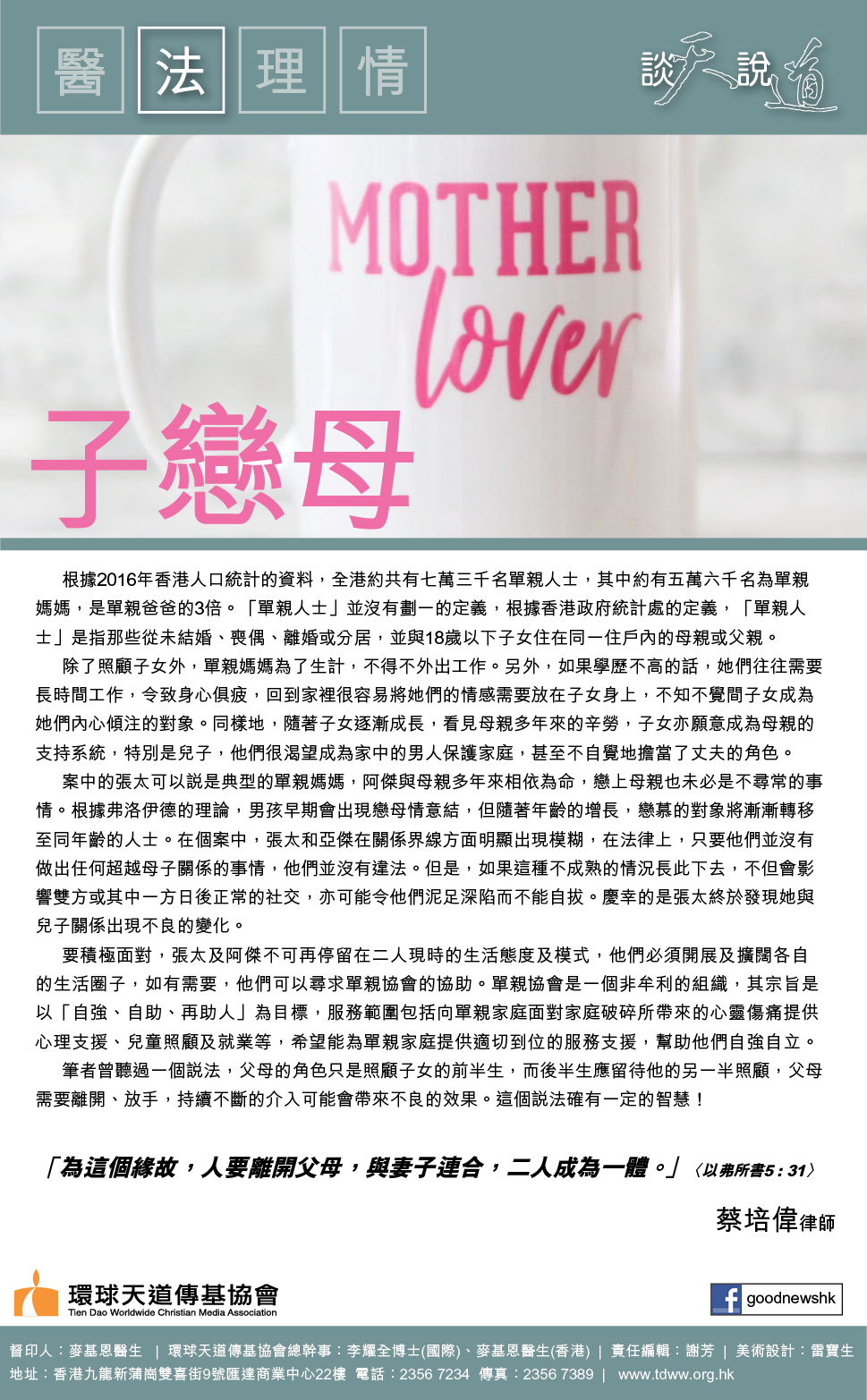 前文指出,根據2016年香港人口統計的資料,全港約共有七萬三千名單親人士,其中約有五萬六千名為單親媽媽,是單親爸爸的3倍。張太像一般單親媽媽那樣,含辛茹苦地將孩子撫養成人,身兼父職,真是困難重重。這些孩子到了青春期,成長上的問題尤其多而複雜,不單受朋輩負面影響,親子間亦會出現不同的張力;即使親子關係良好,也會出現「非正常」的問題。從法律的角度去看,這個案絕對未演變成非法亂倫的情況,反而像是不健康互相依附(co-dependent) 的關係。