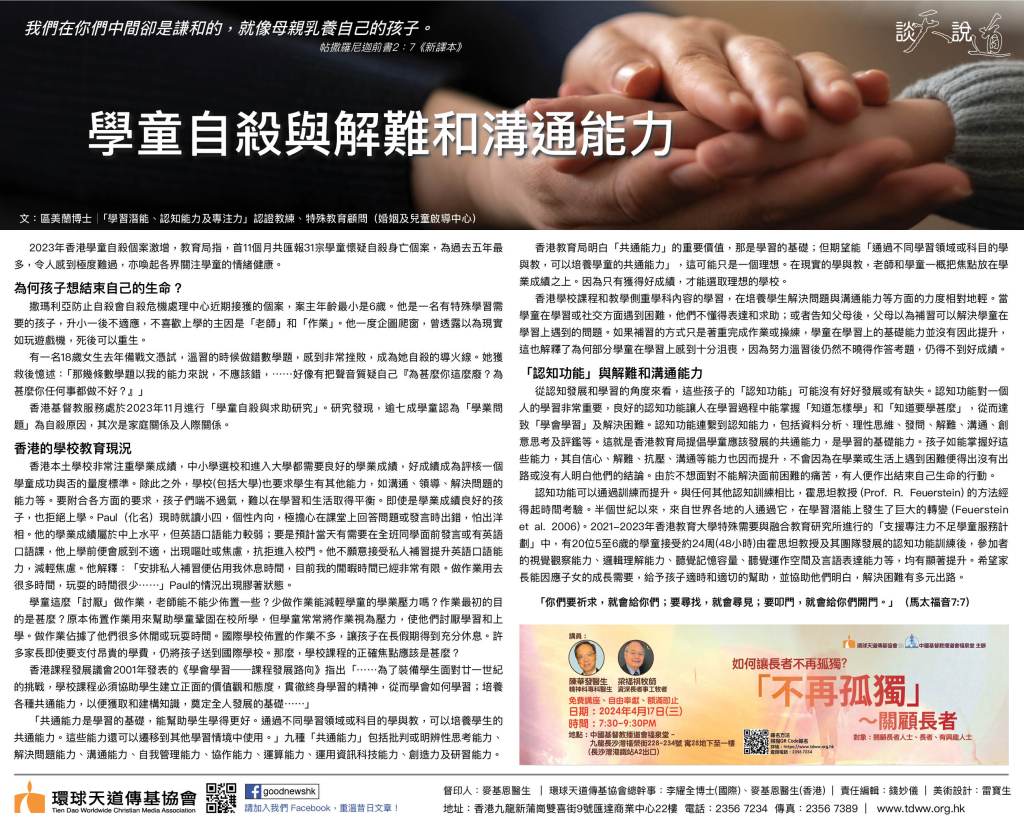 2023年香港學童自殺個案激增,教育局指,首11個月共匯報31宗學童懷疑自殺身亡個案為過去五年最多,令人感到極度難過,亦喚起各界關注學童的情緒健康。