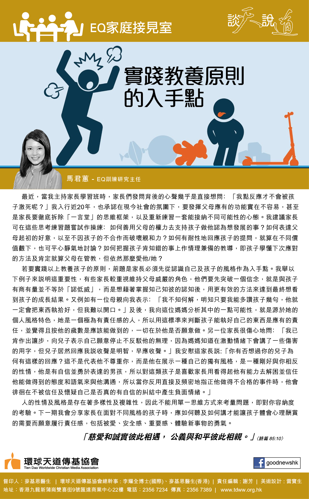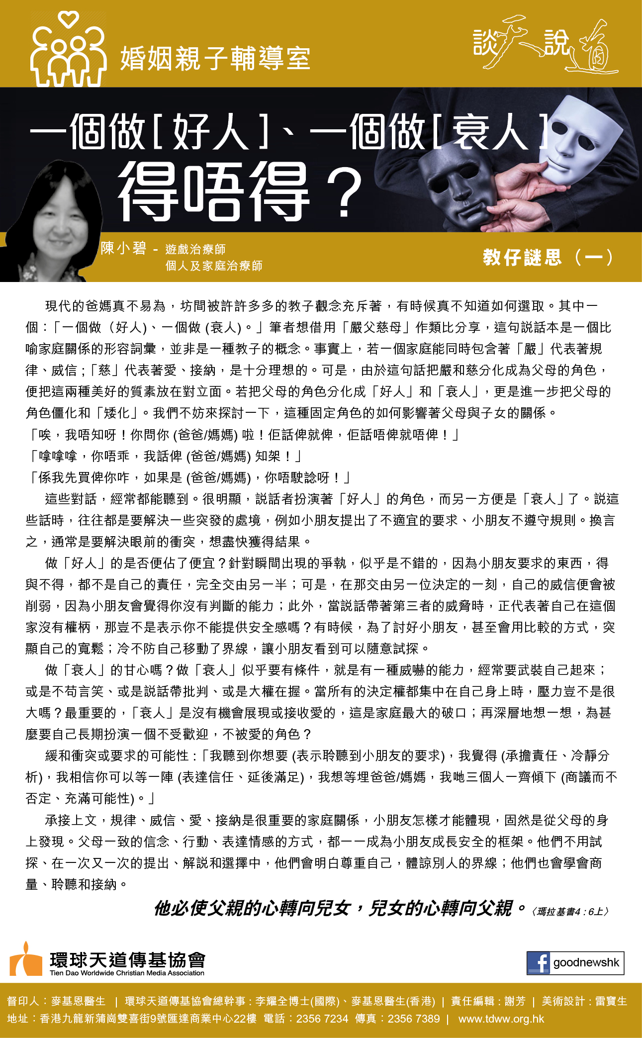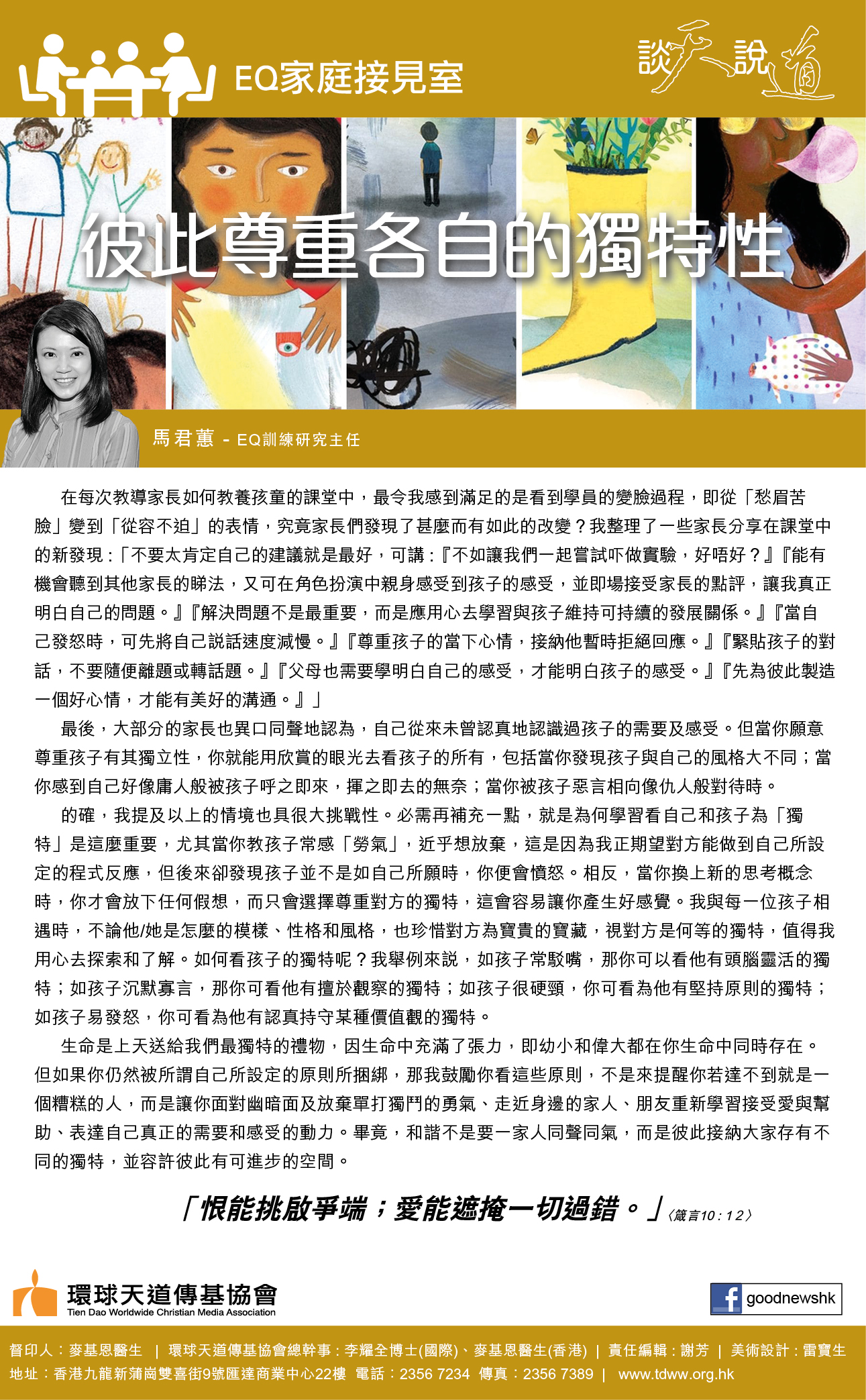 後記﹕上述所提及的大女兒是筆者本人的成長經歷的小片斷。而後來的經歷,感謝主,讓我認識了一位給予力量及啟蒙的好友,伴我肩並肩前行,以充實生命為念,並學習享受凡事樂在其中。當我能夠體會和認識到自己的選擇是以提升自己生命的美好時,自然能肯定自我價值,並感受到真正的喜悅,而這份內在的滿足是他人無法所給予的。