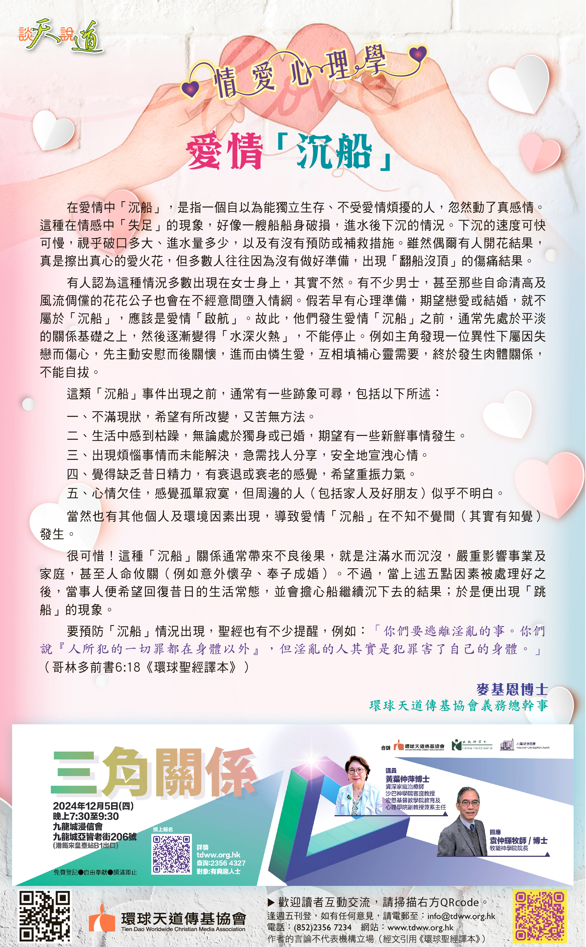 在茫茫人海中,從相識相知,到踏上「永遠愛你」甜蜜蜜婚姻征途,四目交投下作出的「執子之手,與之偕老」承諾。但隨著濃情蜜意的消減,有人選擇為感情增值,有人卻另尋昔日的激情。「丈夫出軌了!」「太太有了新歡!」婚外情的真相為另一半帶來刻骨銘心的痛苦,有人會作失卻理智的自毀行為,甚至禍及下一代。近日又增添因伴侶婚外情而抱著孩子輕生的報導,這些慘劇為我們帶來甚麼的警號?藉著三位在婚姻輔導和兒童心理有研究的專家文章分享,祈望讓大家有提醒。