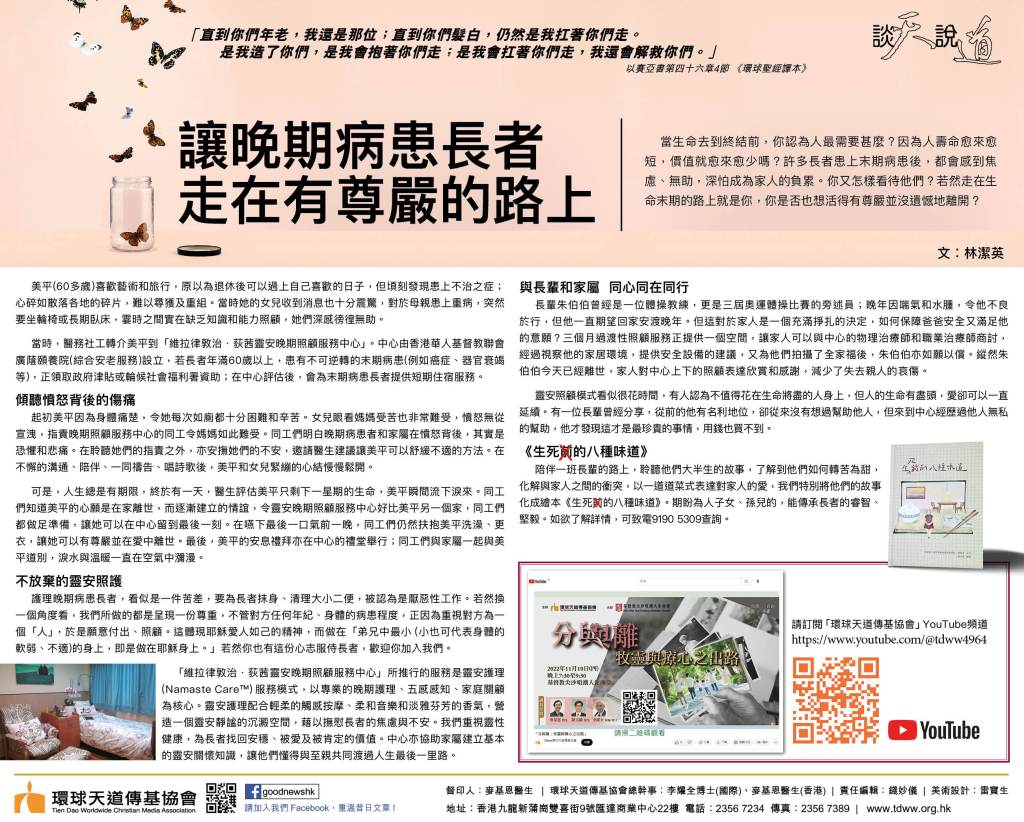 李先生:「那時候護士說,父親剩下的日子不多。幸好當時護士為父親轉介了院牧關心他,向他講解福音,讓一直頑固不肯信主的他,在人生最後的關頭,終於把生命交托給主。感謝主!知道父親可安然離世,以及將來會在天家與他相遇,令我和家人得到不少安慰。」