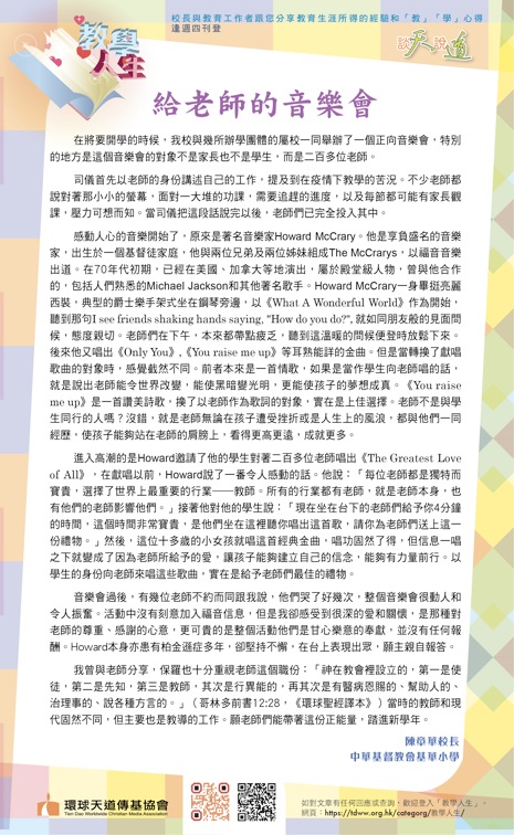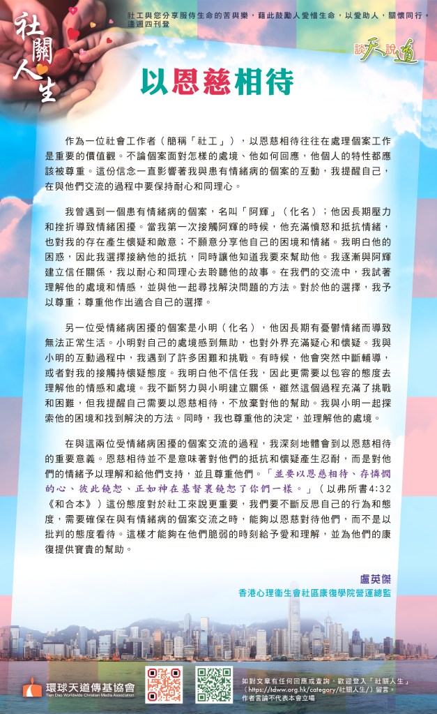 R:我的使命是帶著尊重、關愛和憐憫,藉著按摩(MASSAGE)去舒緩患者身心靈的不適,助人自助;仿效昔日主耶穌行道之時,通過觸摸而進行醫治和表達關愛。把這使命看成神的託付,只要忠心去管理和做好這職分,並享受其中。我的夢想是在家庭、社區、醫院等地方見到更多「用心觸摸」,營造關愛、彼此支持的文化,並將香薰治療應用在健康和醫療中,能讓更多人認識及選擇這輔助療法。