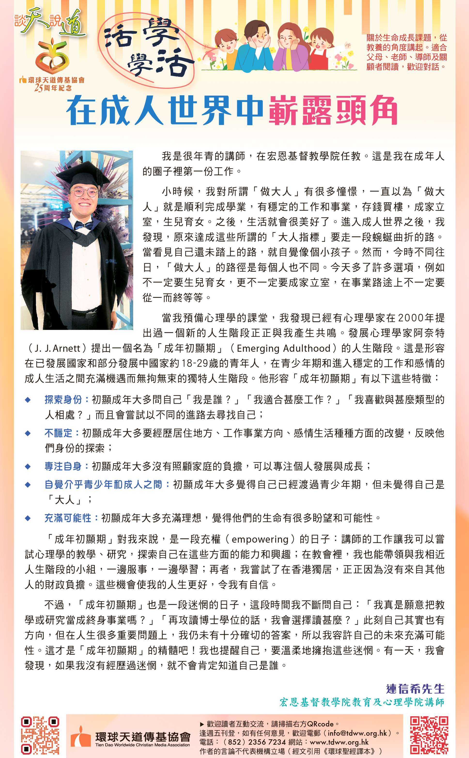 「成年初顯期」對我來說,是一段充權(empowering)的日子:講師的工作讓我可以嘗試心理學的教學、研究,探索自己在這些方面的能力和興趣;在教會裡,我也能帶領與我相近人生階段的小組,一邊服事,一邊學習;再者,我嘗試了在香港獨居,正正因為沒有來自其他人的財政負擔。這些機會使我的人生更好,令我有自信。