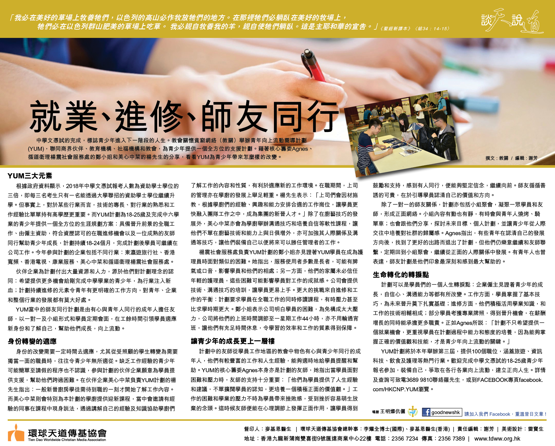 中學文憑試的完成,標誌青少年進入下一階段的人生。教會關懷貧窮網絡(教關)舉辦青年向上流動嚮導計劃(YUM),聯同商界伙伴、教育機構、社福機構和教會,為青少年提供一個全方位的支援計劃。藉著核心籌委Agnes、循道衛理楊震社會服務處的鄭小姐和美心中菜的楊先生的分享,看看YUM為青少年帶來怎麼樣的改變。