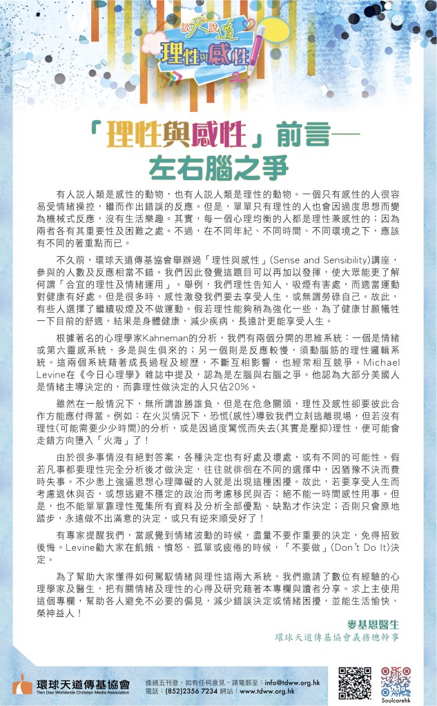左腦是主管理性、組織與計劃,右腦則是比較不規則,主管創意、主觀感受與藝術性。我們經常聽到有人說:「我是左腦人。」又或是:「我是右腦人。」其實沒有真正分類為左腦人或右腦人。在傳統學習上,左腦是傾向發展理性思維。一個小朋友進學校之後,所有的學習都需要組織與計劃,所以自然地較多運用左腦。不過,遠在孩子未有意識之先,他的右腦早已收集身邊的資料,在他懂事之先,他的右腦已經主載了他的看法。所以真正解決問題,特別是在沒有前例可以依據的時候,像新冠肺炎底下,所有事情都不按常規發生,我們則需要更大包容,更多創意,才可突圍而出。當然,左腦右腦合作並用才可以更有效地處理問題。