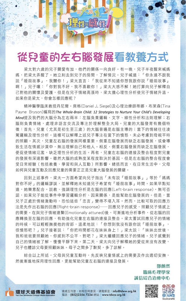 在人際關係的處理上,我們更需要兼顧左右腦的訊息。因為右腦的感覺沒有處理好,左腦很難安定地學習和解決困難。例如,一個很沮喪的學生向老師申訴功課的困難程度。如果老師只管指示他做功課的方法,而忘記了幫助學生處理沮喪情緒,對學生未必是最有效的幫助。因為學生需要的幫助不是提醒他更努力,他的問題也不是在能力方面,反而是同理與共情。在許多學生的學習經驗中,經常被要求,所以學習往往帶著許多恐懼。不過,當他們覺得被明白和接納,他們便有勇氣再接再厲。我們稱這做法為「以學生為本」的教學。