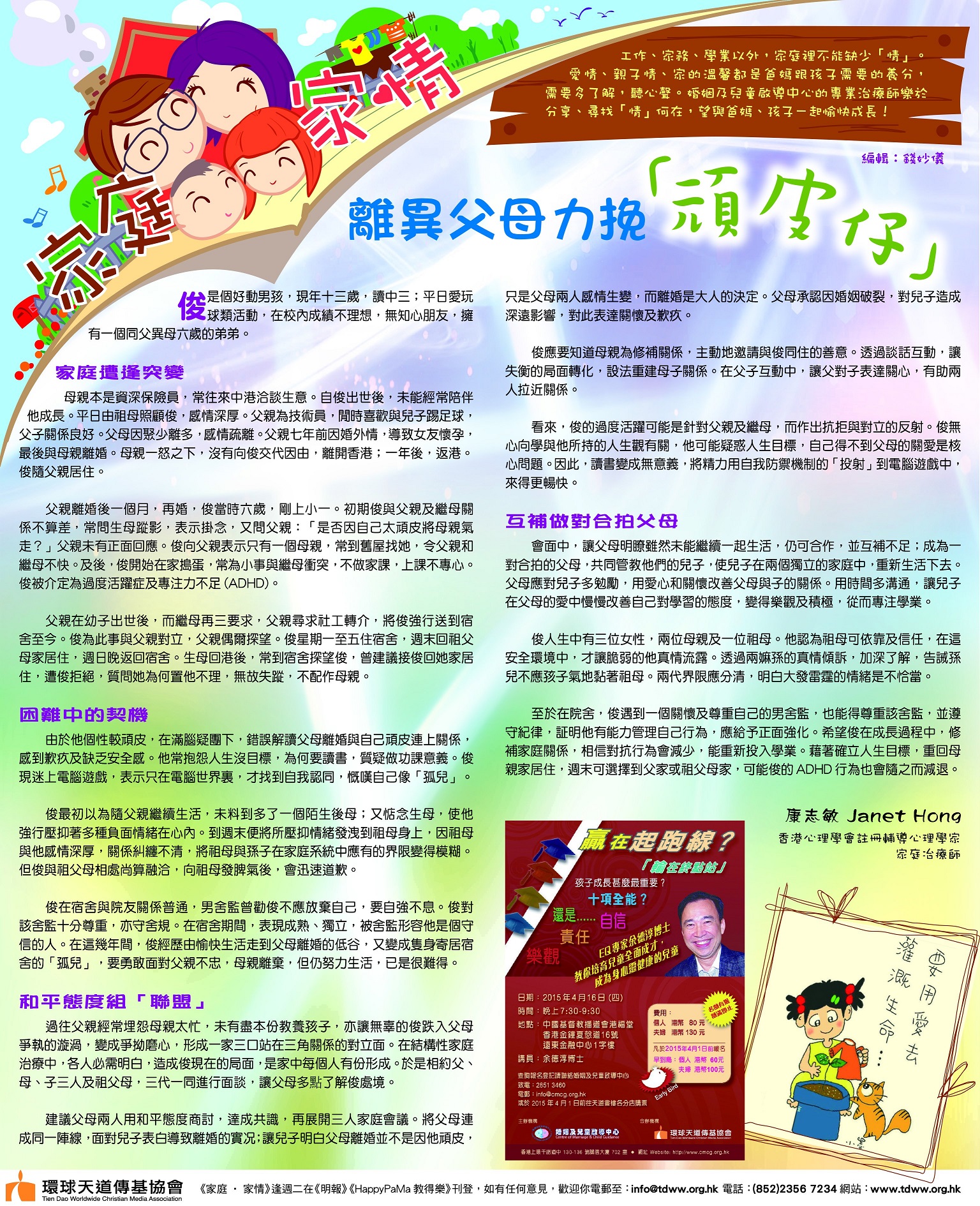 個案主人晴晴是一位獨生女,在初小已被發現患有讀寫障礙,父母馬上尋找專業幫手,讓她接受訓練。父親是個大忙人,他將在家訓練的重任交給家庭主婦的太太,也會在適當時間給予鼓勵和讚賞。