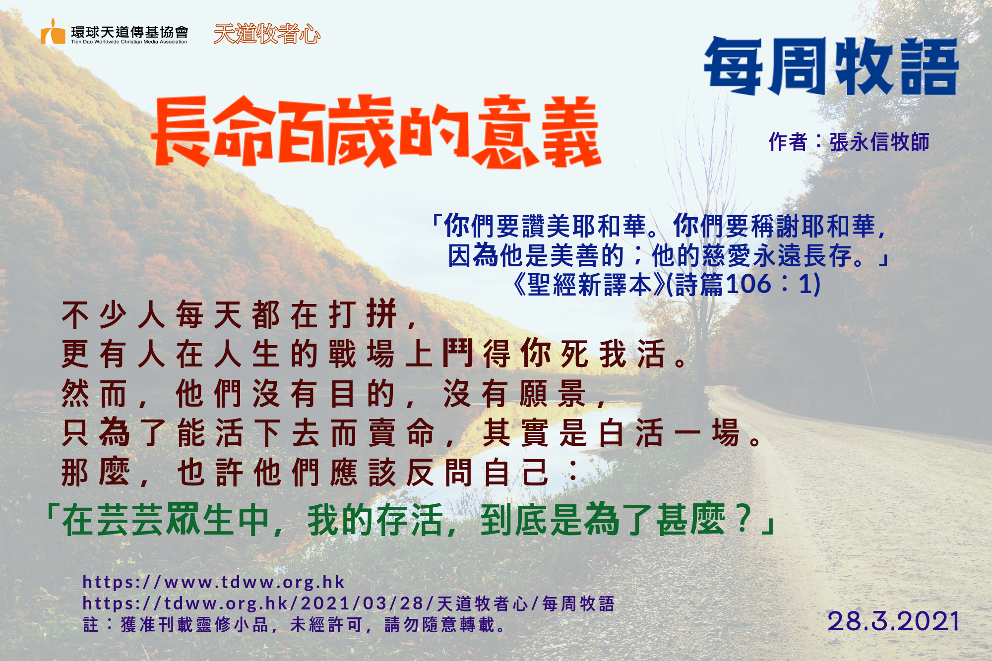 心靈禱告:慈愛主,我不求長壽,但我求祢讓我活一個有方向、有目標的人生,好叫我不白活此生。