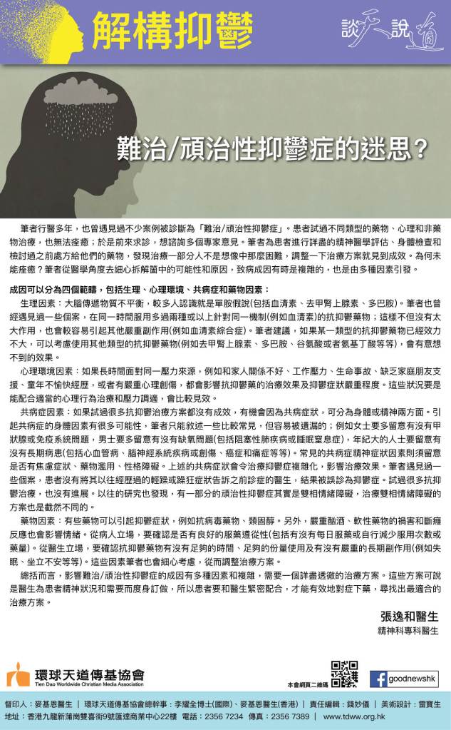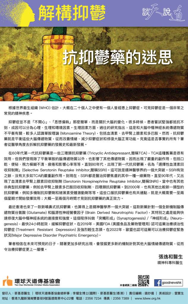 亞洲神經精神藥物醫學會出版《解構憂鬱》不僅要傳遞醫學知識,還要幫助病人改變固有的思維模式,從而更新,重新獲得人生的希望與力量。《解構憂鬱》這書名已經直接點出書本主旨,就是全面講解憂鬱症,包括憂鬱症的成因、病徵、藥物及非藥物多種治療手段,甚至與之相關的共病性疾病;讓讀者從多角度認識憂鬱症。世界衞生組織(WHO)指出,全球約有5% 的成年人患有憂鬱症,更預計去到2030 年憂鬱症可能成為全球頭號疾病。憂鬱症是個普遍的精神疾病,有不同層面的患者,包括孕婦、小孩、青少年、成年人及至老人,作者從不同病人的病徵講解疾病及其治療的方案。一方面講解明白,減少病人及大眾的疑慮;另一方面,讓病人獲得更多疾病的資訊,從而獲鼓勵及早積極投入治療,望能盡快復元。復元人士又可以調整日常生活習慣,幫助自己重建健康生活方式並減低復發機會。預防勝於治療,書中也介紹了健康飲食、運動,並鼓勵人建立恆常社交活動,良好人際互動有益身心,也有正面的預防作用。