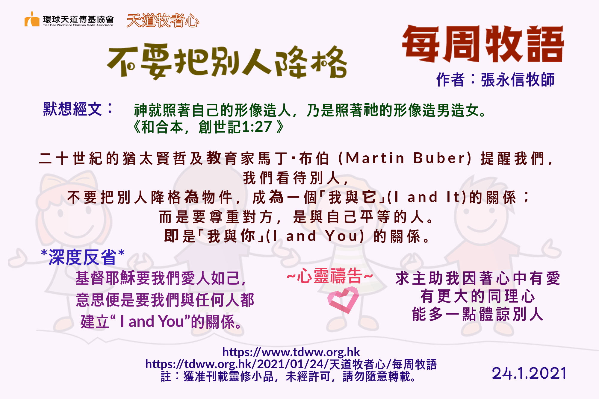 在此,二十世紀的猶太賢哲及教育家馬丁‧布伯(Martin Buber)提醒我們,我們看待別人,不要把別人降格為物件,成為一個「我與它」(I and It)的關係;而是要尊重對方,是與自己平等的人。即是「我與你」(I and You) 的關係。