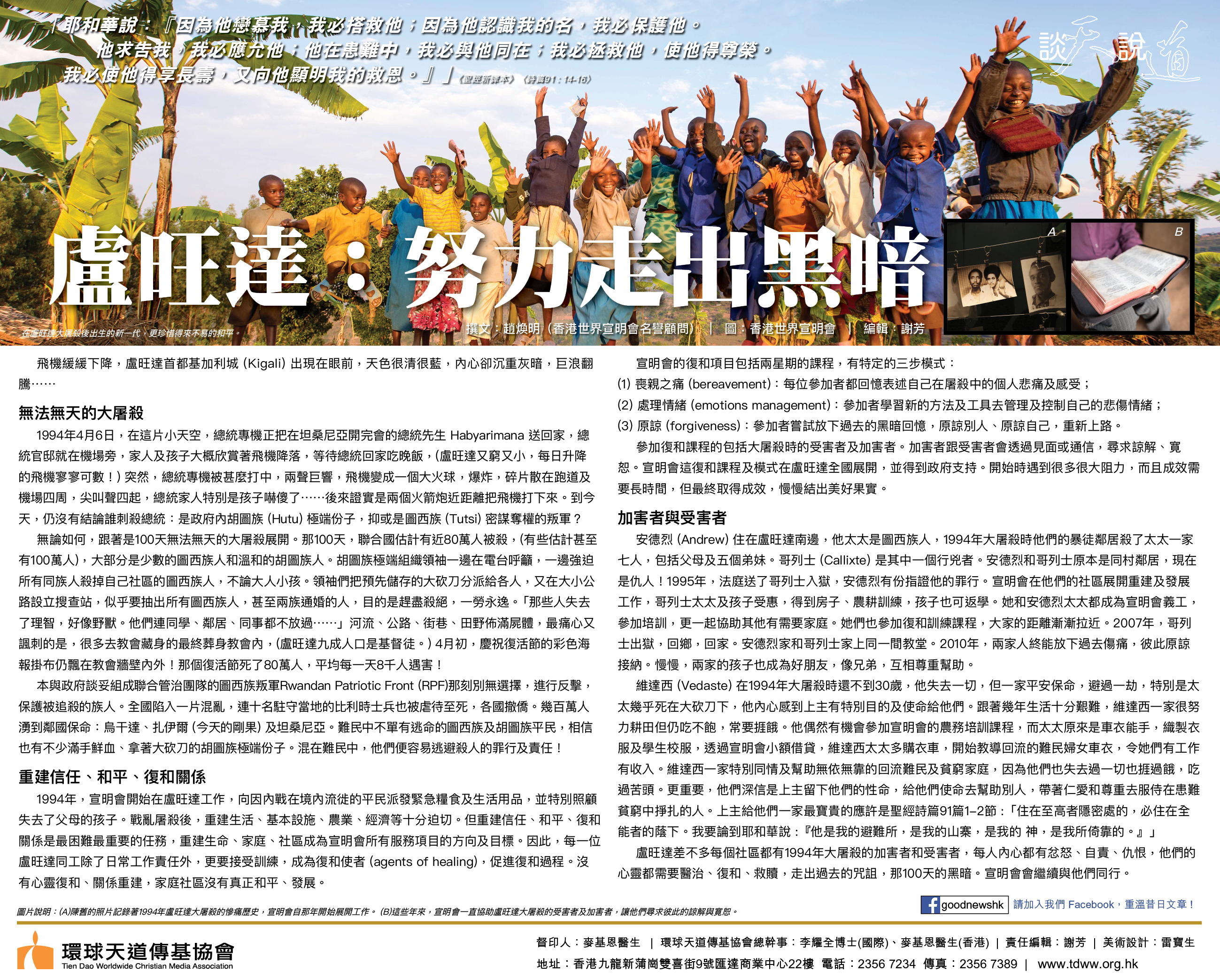 圖片說明: (1)在盧旺達大屠殺後出生的新一代,更珍惜得來不易的和平。 (2)陳舊的照片記錄著1994年盧旺達大屠殺的慘痛歷史,宣明會自那年開始展開工作。 (3)這些年來,宣明會一直協助盧旺達大屠殺的受害者及加害者,讓他們尋求彼此的諒解與寛恕。