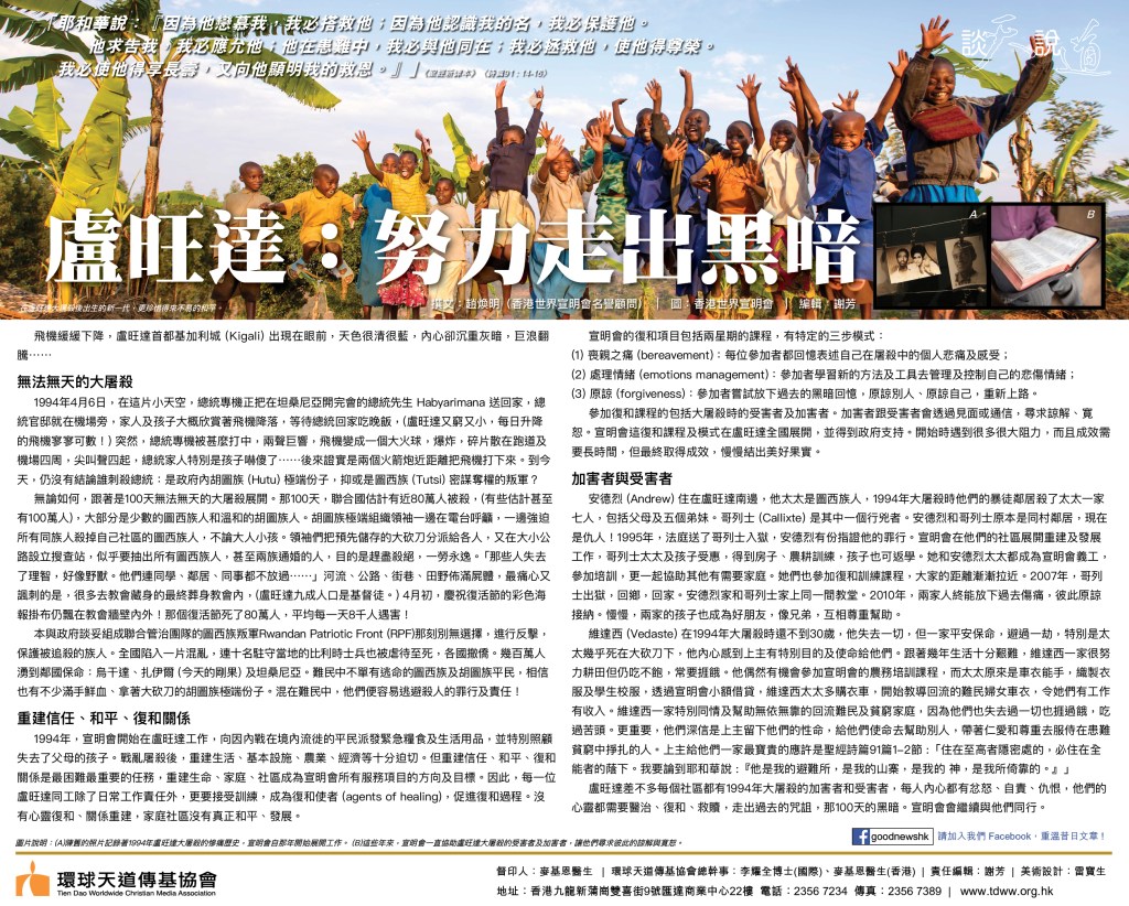 盧旺達差不多每個社區都有1994年大屠殺的加害者和受害者,每人內心都有忿怒、自責、仇恨,他們的心靈都需要醫治、復和、救贖,走出過去的咒詛,那100天的黑暗。宣明會會繼續與他們同行。