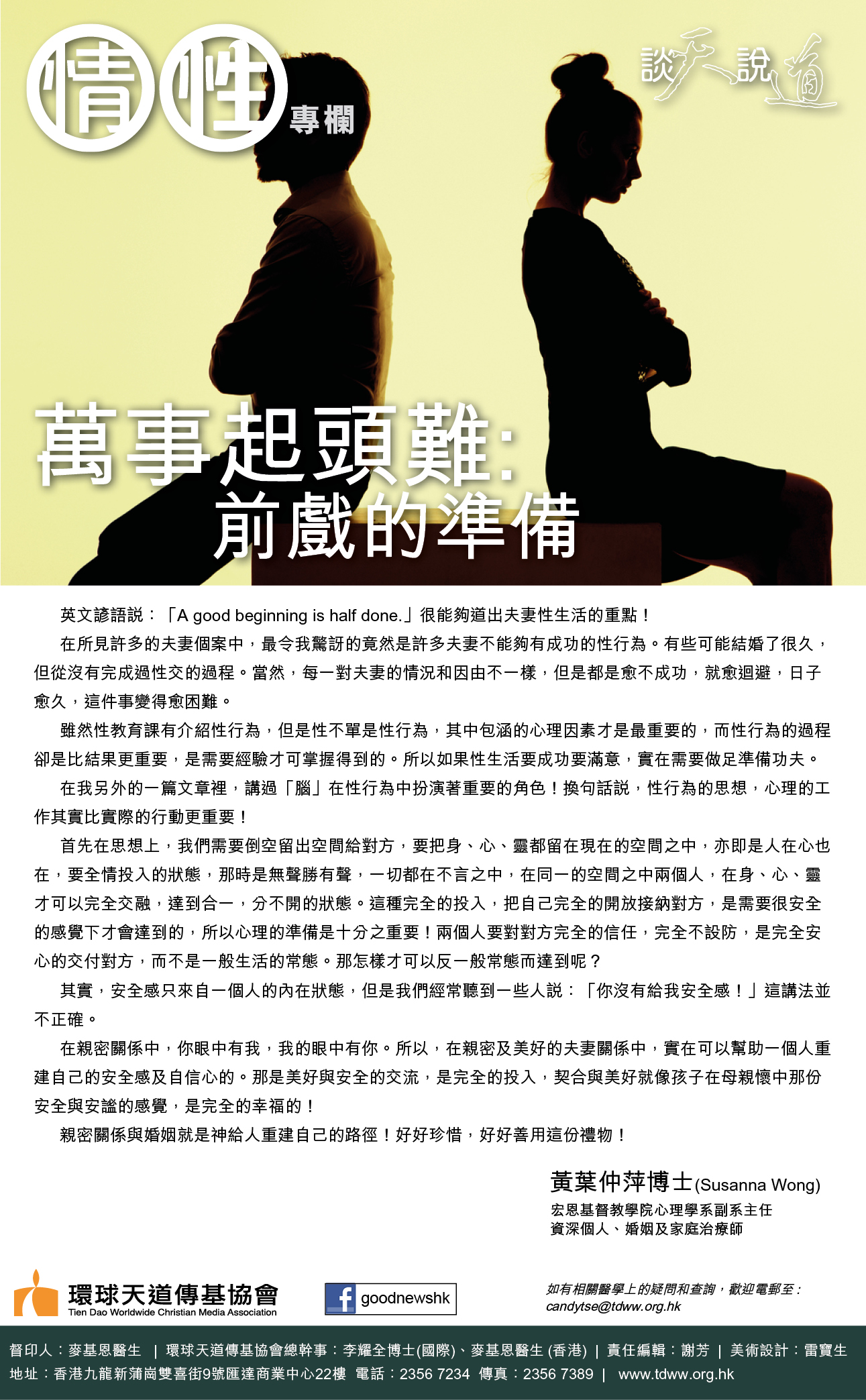 夫妻生活日子久了,累積了許多失意或是不滿,可能只是生活習慣的不同,不是愛與不愛的問題,亦可能只是沒有把自己真實的需要說出來。甚至有時說了出來,也可能只聽了,收的另外一方收錯訊息,所以未能達到如期的效果。