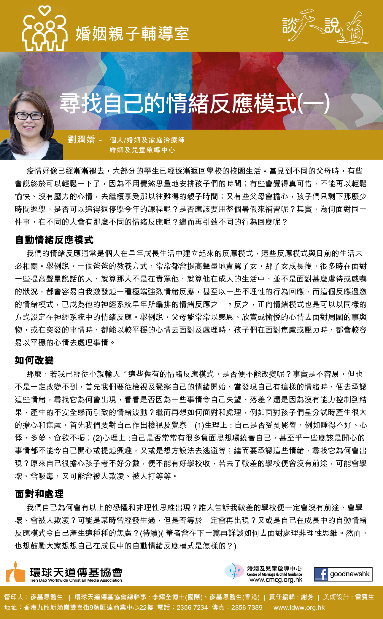 我們要學習活在當下,就是接納現在這個不確定或不完美,並珍惜現在的所有。正面的經驗就是尋找過往自己在這些非理性思維後的正面經歷,你會自豪發現自己曾經怎樣經過和戰勝它。一家人一起分享自己或別人走過的艱難經歷、內心的害怕,以及如何踏出或勇敢的「搏戰」,上帝又是怎樣陪伴我們經過每一處…,這些都會成為我們及子女的成長動力和能力,更有勇氣去面對自己的挑戰。