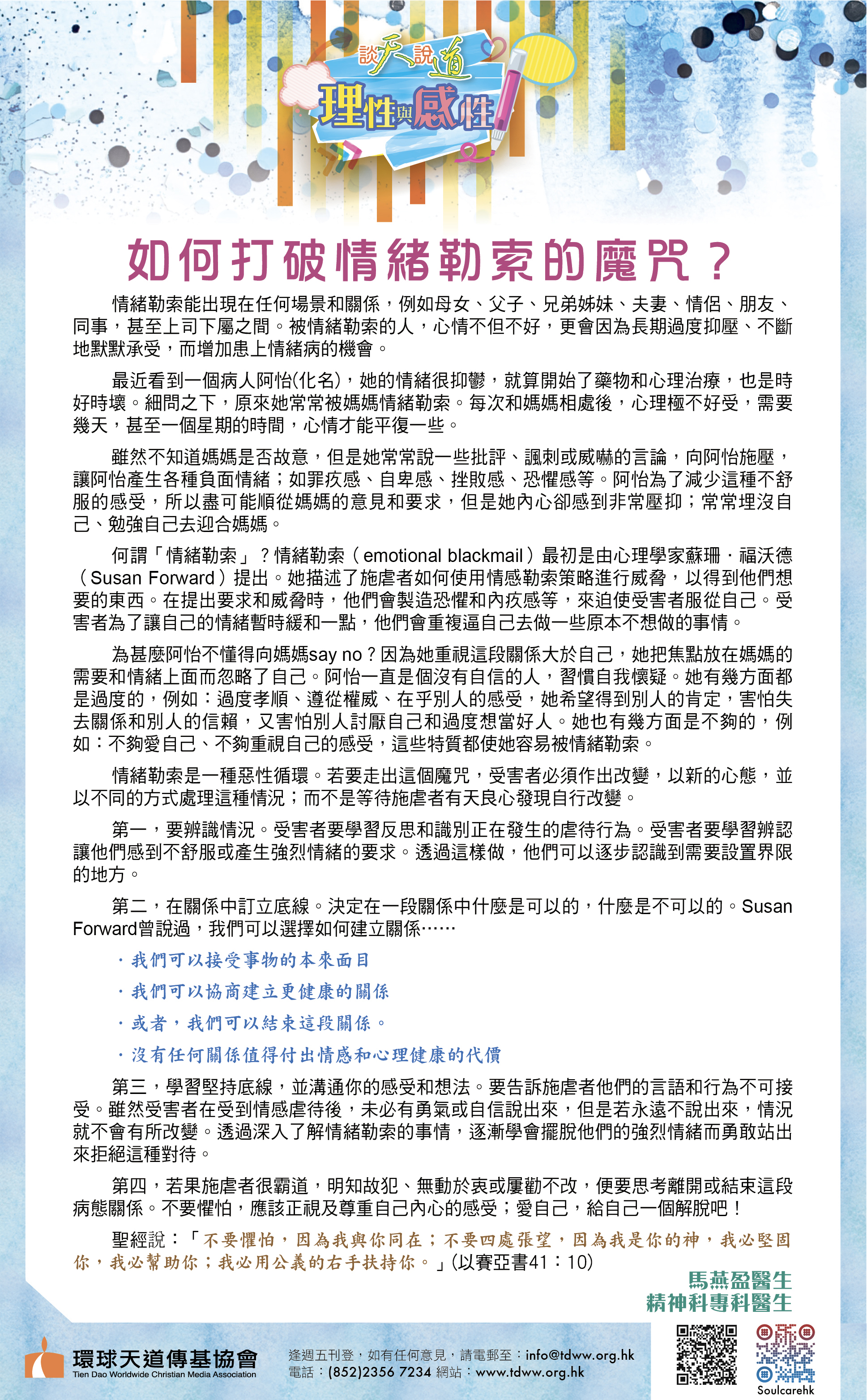 作為一位社會工作者(簡稱「社工」),以恩慈相待往往在處理個案工作是重要的價值觀。不論個案面對怎樣的處境、他如何回應,他個人的特性都應該被尊重。這份信念一直影響著我與患有情緒病的個案的互動,我提醒自己,在與他們交流的過程中要保持耐心和同理心。
