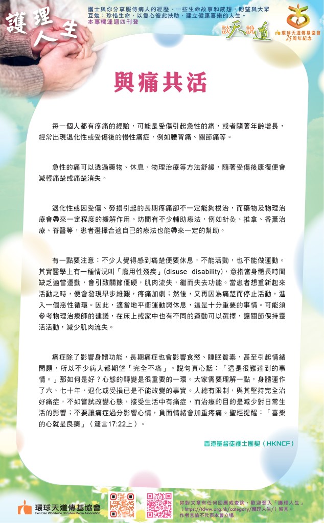痛症除了影響身體功能,長期痛症也會影響食慾、睡眠質素,甚至引起情緒問題,所以不少病人都期望「完全不痛」。說句真心話:「這是很難達到的事情。」那如何是好?心態的轉變是很重要的一環。大家需要理解一點,身體運作了六、七十年,退化或受損已是不能改變的事實。人總有限制,與其堅持完全治好痛症,不如嘗試改變心態,接受生活中有痛症,而治療的目的是減少對日常生活的影響;不要讓痛症過分影響心情,負面情緒會加重疼痛。聖經提醒:「喜樂的心就是良藥」(箴言17:22上)。