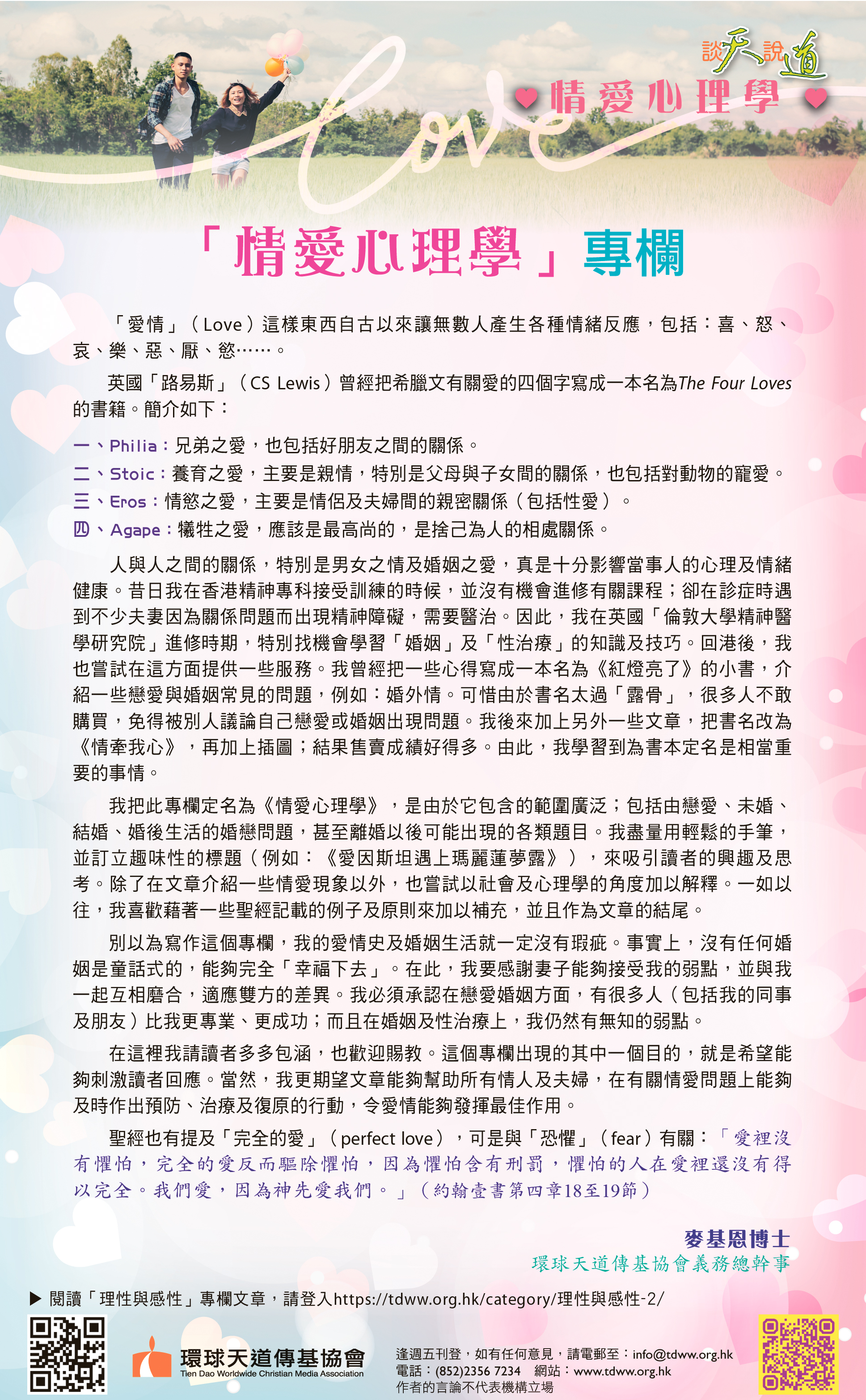 聖經說:「在愛裡沒有懼怕,完美的愛反而驅除懼怕,因為懼怕意味著刑罰,懼怕的人在愛這回事上還沒有完美。」(約翰壹書4:18)這經文的意思是,真正完美的愛之中沒有恐懼,恐懼帶來折磨;完美的愛卻驅除恐懼,使人在愛中得完全。完全的英文是“perfect”,是完美的意思。人可以在完美的愛裡變得完美。這正是主耶穌對待我們的愛,完全完美的愛是從神而來,而且是無條件。我們都是罪人,會犯錯、軟弱,但神仍然無條件地以完美的愛來愛我們。因耶穌被釘十字架,以死來贖我們的罪,以主的血塗抹我們的過犯。即使將來在主的審判台前,我們也不會被定罪,反而有永恆生命而完全。在主耶穌身上,我們看到愛是無條件及捨己。我們不能夠做甚麼事或靠行為換取主這份無條件及捨己的愛,這份愛是白白送給我們。