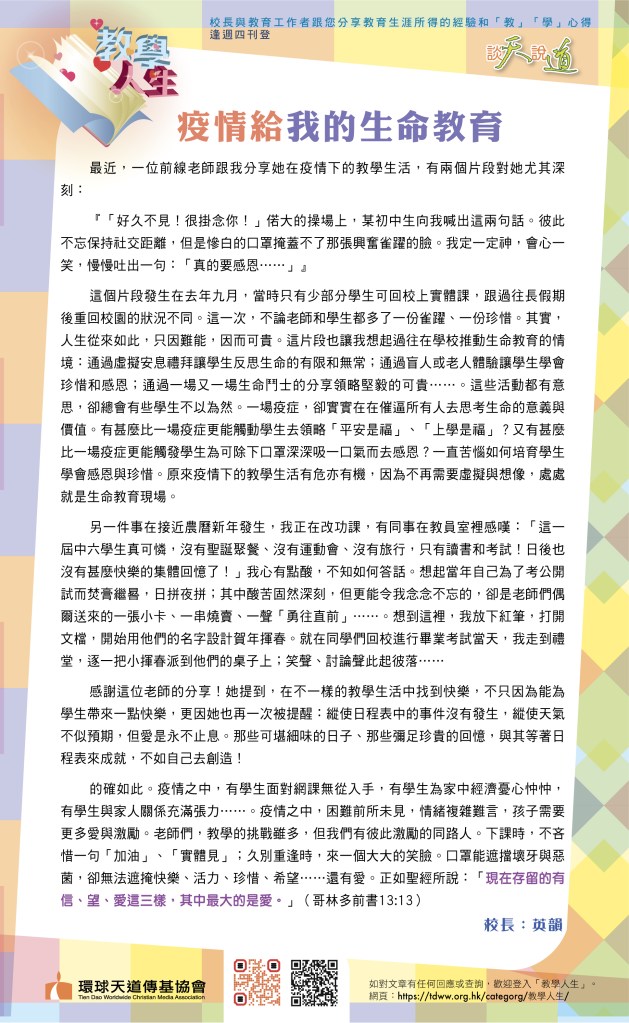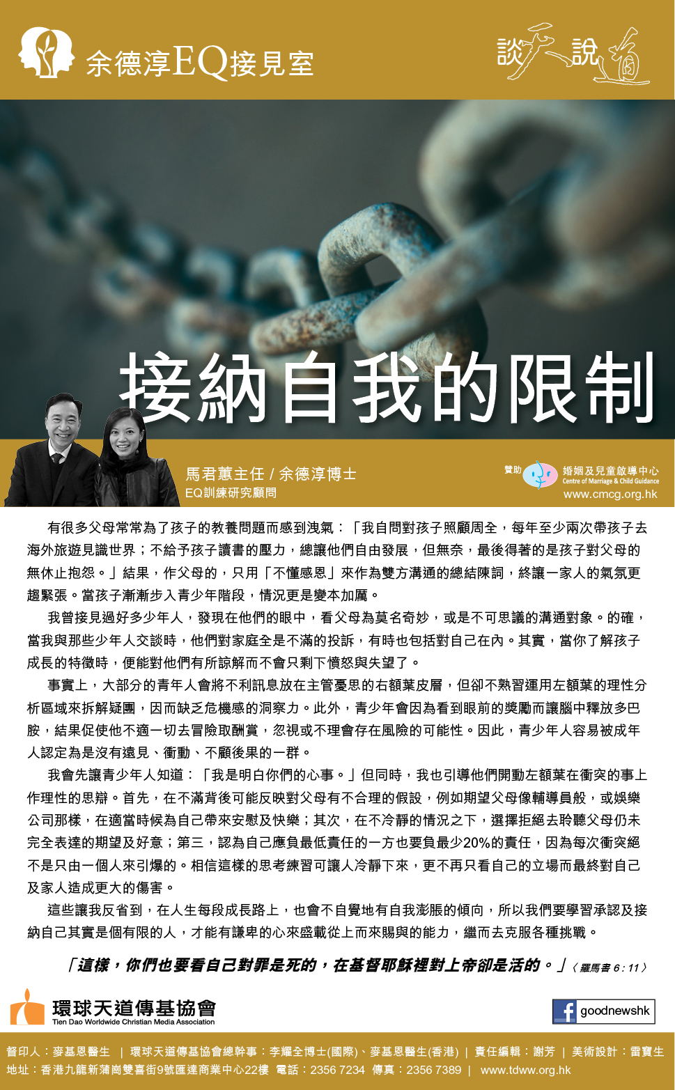「其實敬虔而又知足,就是得大利的途徑,因為我們沒有帶甚麼到世上來,也不能帶甚麼去。只要有衣有食,就應當知足。」