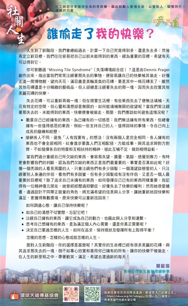 是的,生活要有愉悅感。不過,當夫婦的感情、朋友間的關係失去了以往有的「感覺」,筆者卻認為要先修補及維繫而非要作「斷捨離」。親密的、好的關係,當然要保存,而冷淡下來的關係可否先去挽救而非放棄呢?那麼人才不會變成為只從自己單方的感覺去看世界:「好則要;不好則不要」,並將自己變為了孤島。人與人的關係,愈長久愈要珍惜,雖然再沒有令你「怦然心動」但卻仍然可愛。