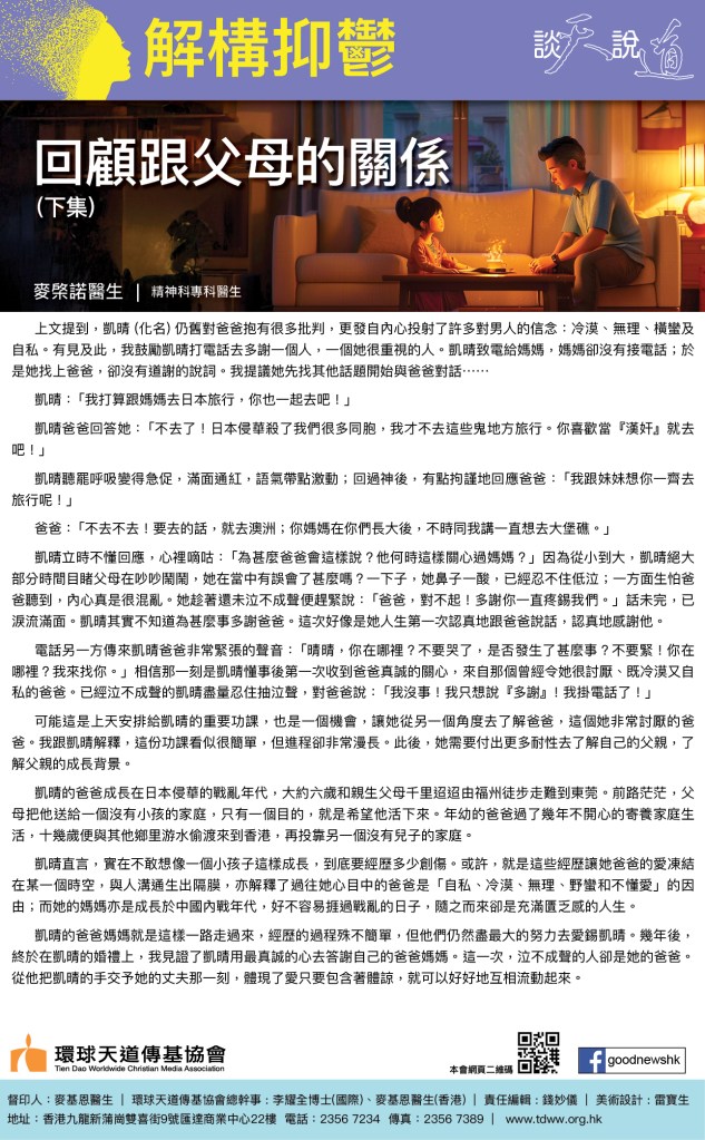 可能這是上天安排給凱晴的重要功課,也是一個機會,讓她從另一個角度去了解爸爸,這個她非常討厭的爸爸。我跟凱晴解釋,這份功課看似很簡單,但進程卻非常漫長。此後,她需要付出更多耐性去了解自己的父親,了解父親的成長背景。