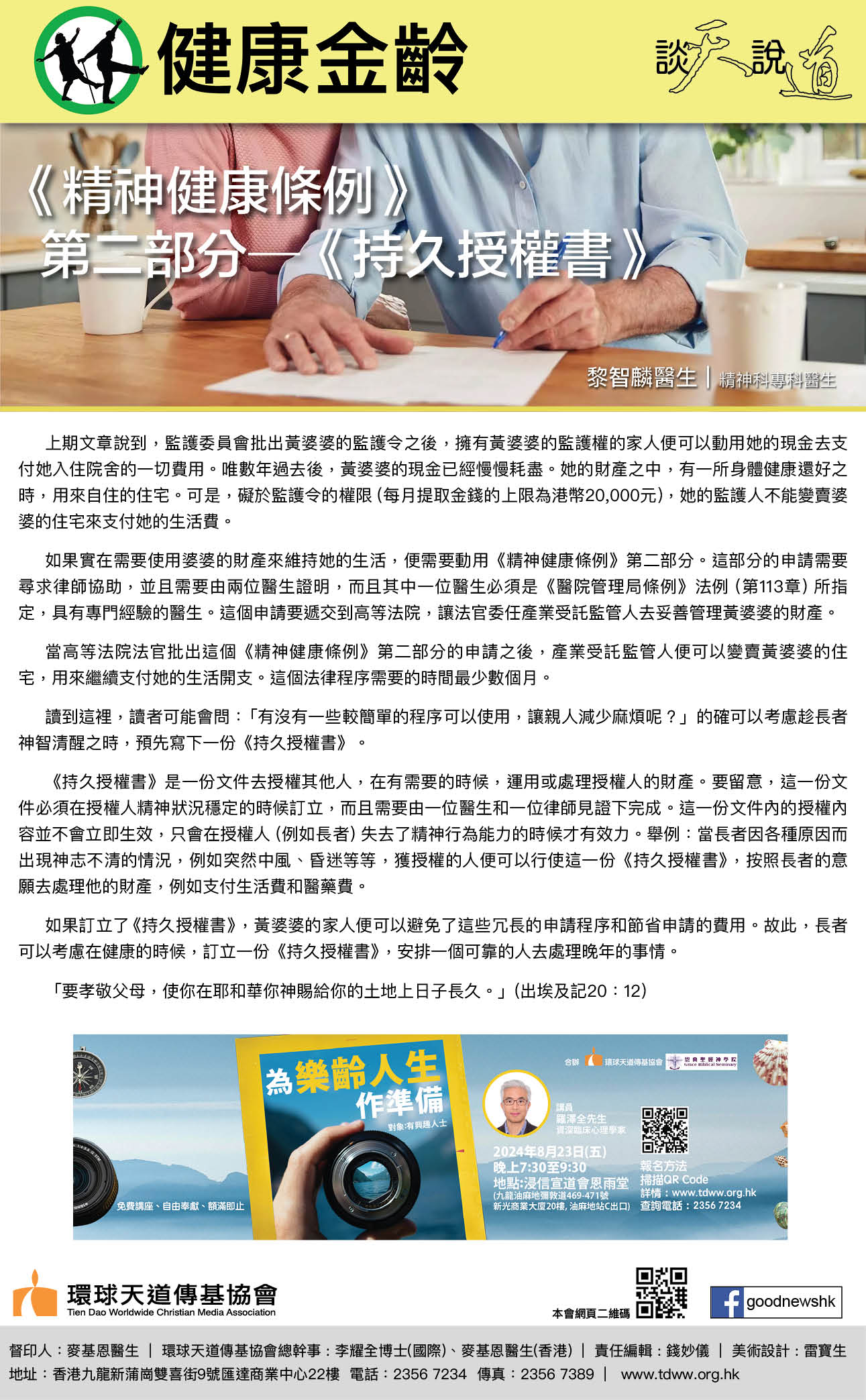 - 持久授權書:香港法例第501章《持久授權書條例》制定的目的是依照授權人的意願,指定受權人在他失去精神行爲能力之時,處理他的財政事項。持久授權書的好處:可以避免複雜及費用高昂的法律程序,例如申請監護令以動用病人財產作接受治療等用途;在授權人失去能力之時,由受權人代理;這在人口急速老化及認知障礙症患者相應增加之時,確實是一項非常重要的措施。