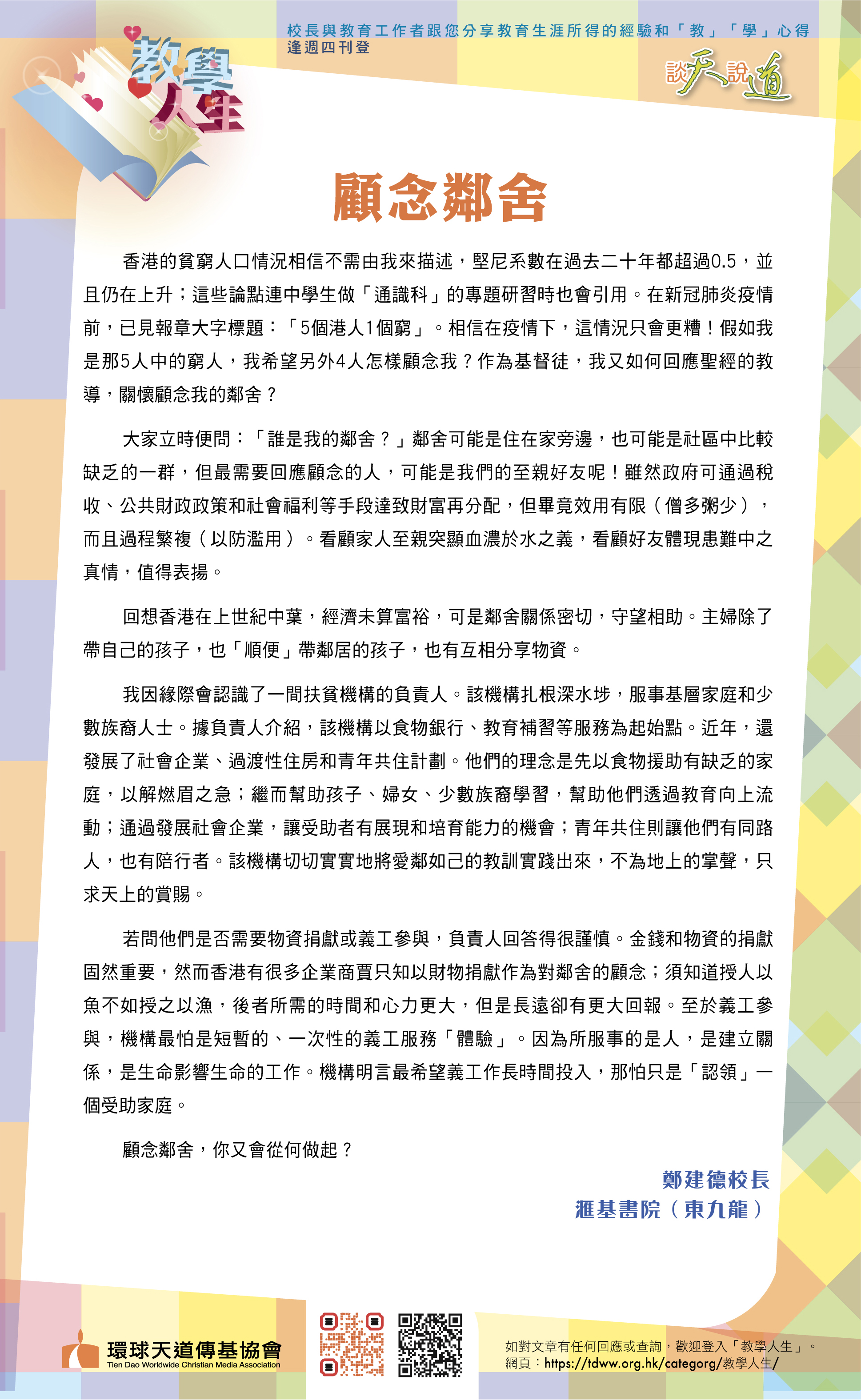 正如聖經說:「只把一杯涼水給這小子裏的一個喝、我實在告訴你們、這人不能不得賞賜。」(馬太福音10:42)本校推行「讓我閃耀」師友計劃,透過兩周課後老師指導,在學習及成長路上啟導學生,建立學習及閱讀習慣,提升學習策略及語文能力,培養積極學習態度,並鼓勵參加校外比賽及活動,啟發學生的潛能。就「閱讀」來說,老師教導學生,不在於授人以魚,而在於授人以漁;學生只要每天都能閱讀一個小時,建立英文字彙,識字就是漁竿,培養學生閱讀能力,正是將漁竿給予學生。長久下來,只要養成每天閱讀的習慣,就有足夠的累積,放長線釣大魚,產生非常大的力量。