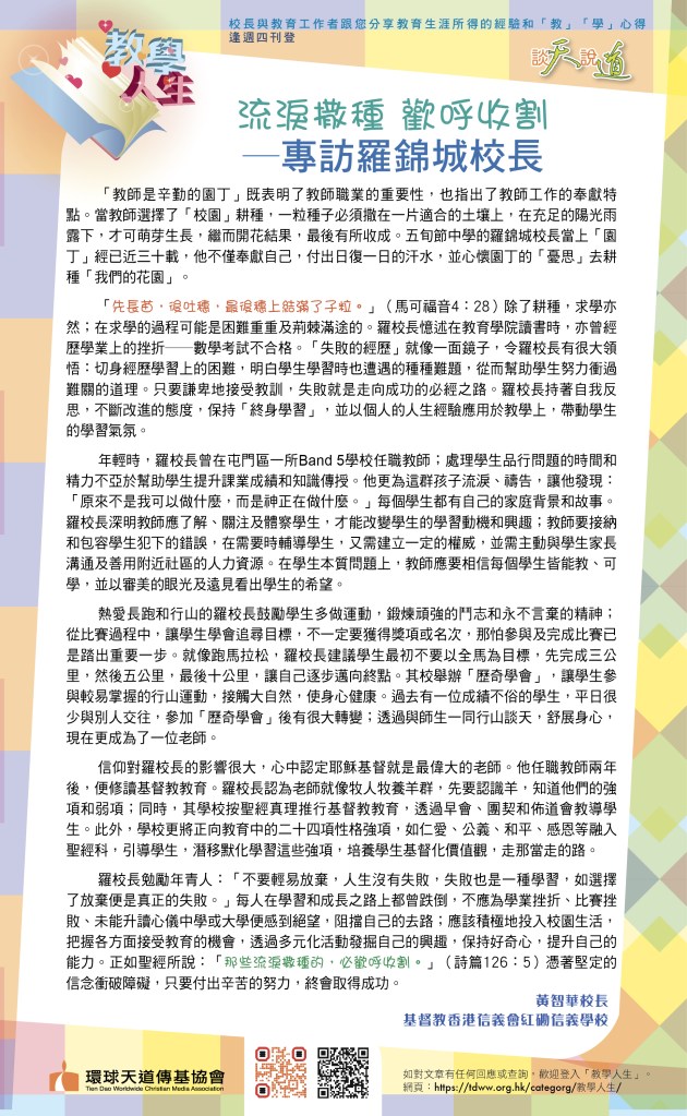 在我初為人師時,校長經常關心教師們的教會及團契生活,又適時以聖經金句作鼓勵。他又經常鼓勵未信主的老師,嘗試參與宗教活動。除此之外,更見校長與家長建立了真摯的相處關係,有助家長認識福音。往後,又繼續遇到不同的基督徒校長,從中也體會了校長為著教育的堅持與謙卑;為著學校發展而身體力行;為著老師的成長而成就他們的夢……