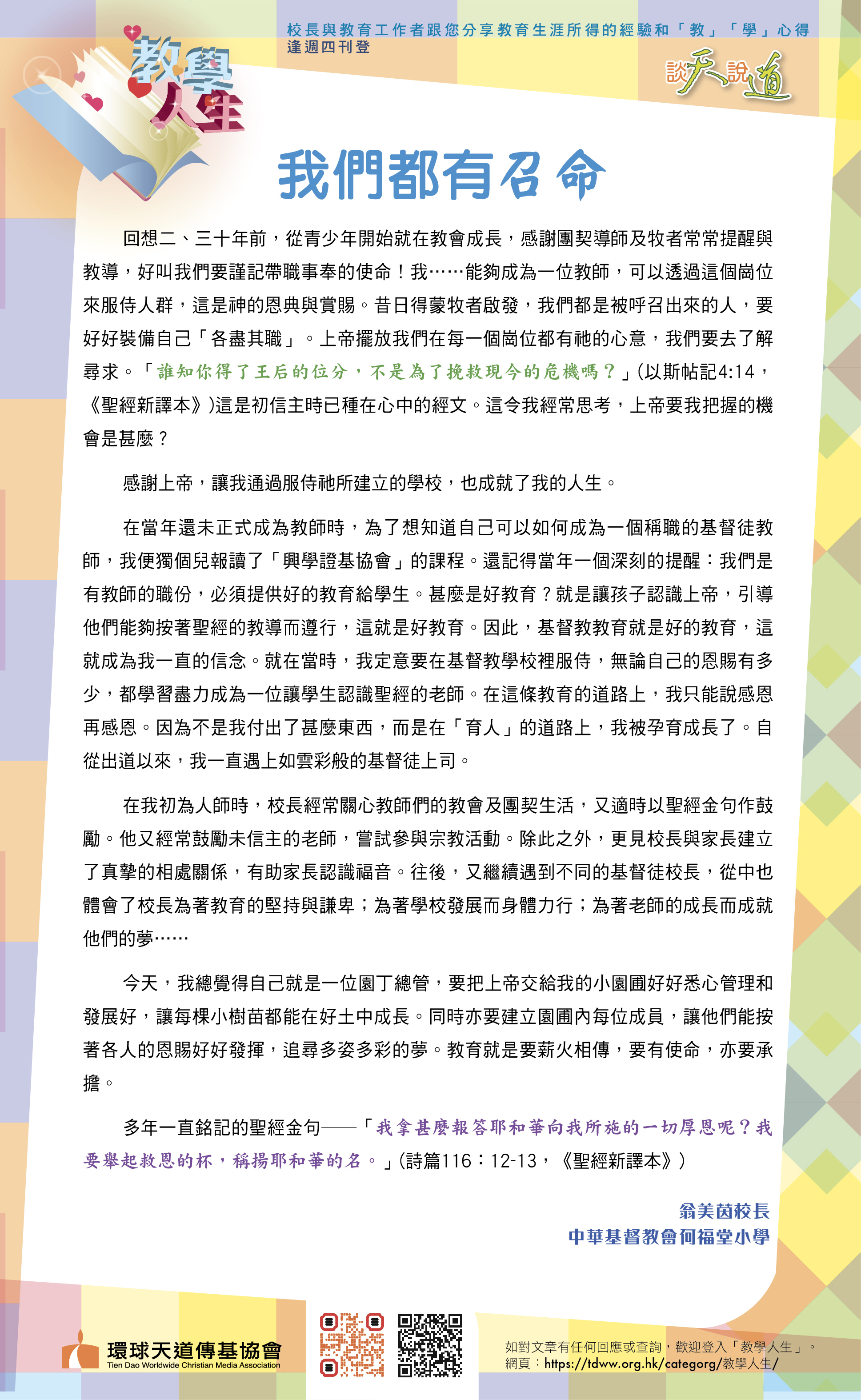 回想二、三十年前,從青少年開始就在教會成長,感謝團契導師及牧者常常提醒與教導,好叫我們要謹記帶職事奉的使命!我……能夠成為一位教師,可以透過這個崗位來服侍人群,這是神的恩典與賞賜。昔日得蒙牧者啟發,我們都是被呼召出來的人,要好好裝備自己「各盡其職」。上帝擺放我們在每一個崗位都有祂的心意,我們要去了解尋求。「誰知你得了王后的位分,不是為了挽救現今的危機嗎?」(以斯帖記4:14,《聖經新譯本》)這是初信主時已種在心中的經文。這令我經常思考,上帝要我把握的機會是甚麼?