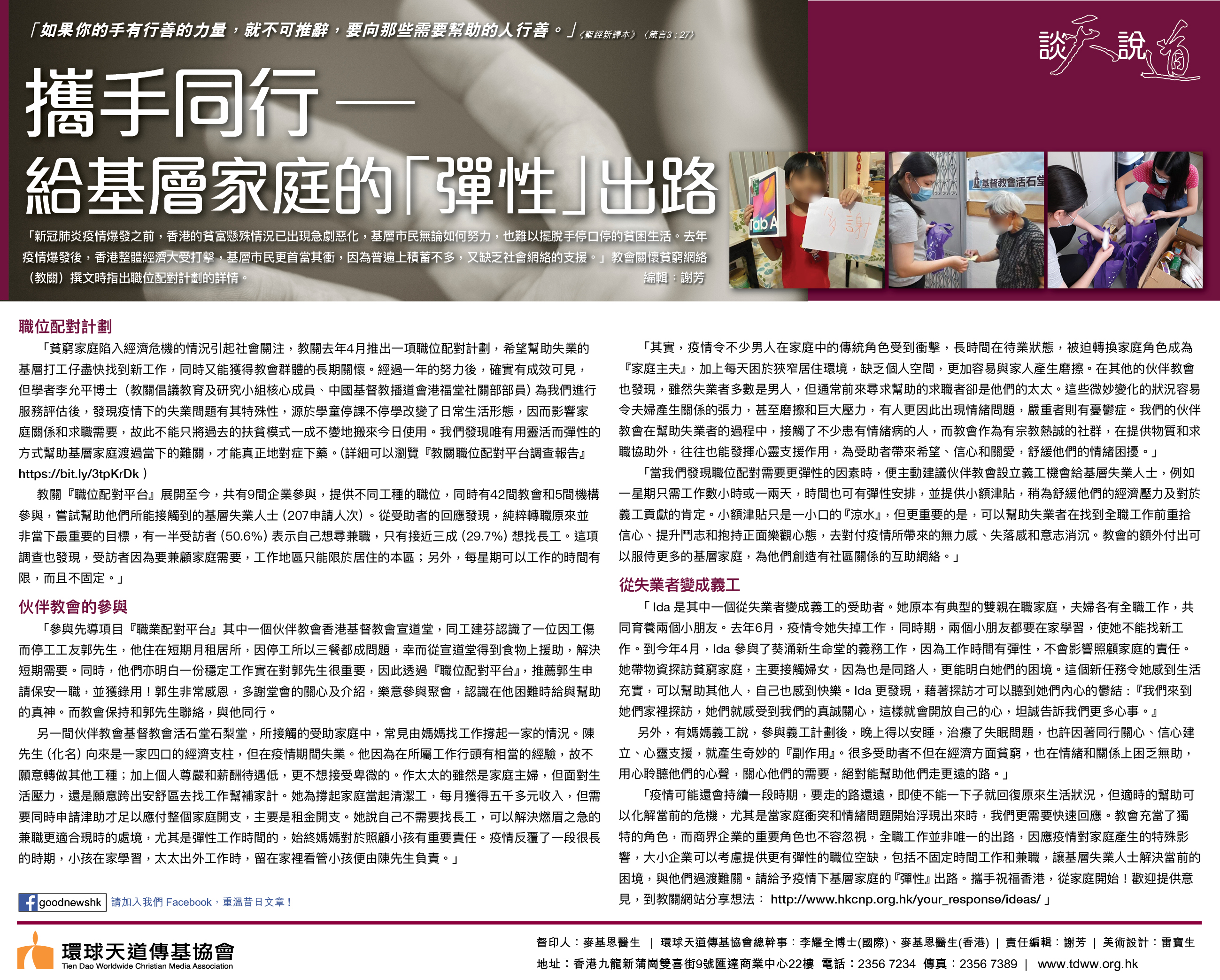 走進社區關懷人群不是困難的事,確實讓我們親身經歷「施比受更為有福」的福氣。以上這些分享讓我們實在地看見,當你願意跨越界限,不輕看自己所擁有的資源,並願意分享,即使是微少的付出也有奇妙的效果。「教關」會連結一班彼此守望同行的有心人,當你願意參與,便能親身體驗關懷貧窮、網絡同行、轉化社區的美好。如你有感動參與,歡迎與我們聯絡;也可瀏覽網站