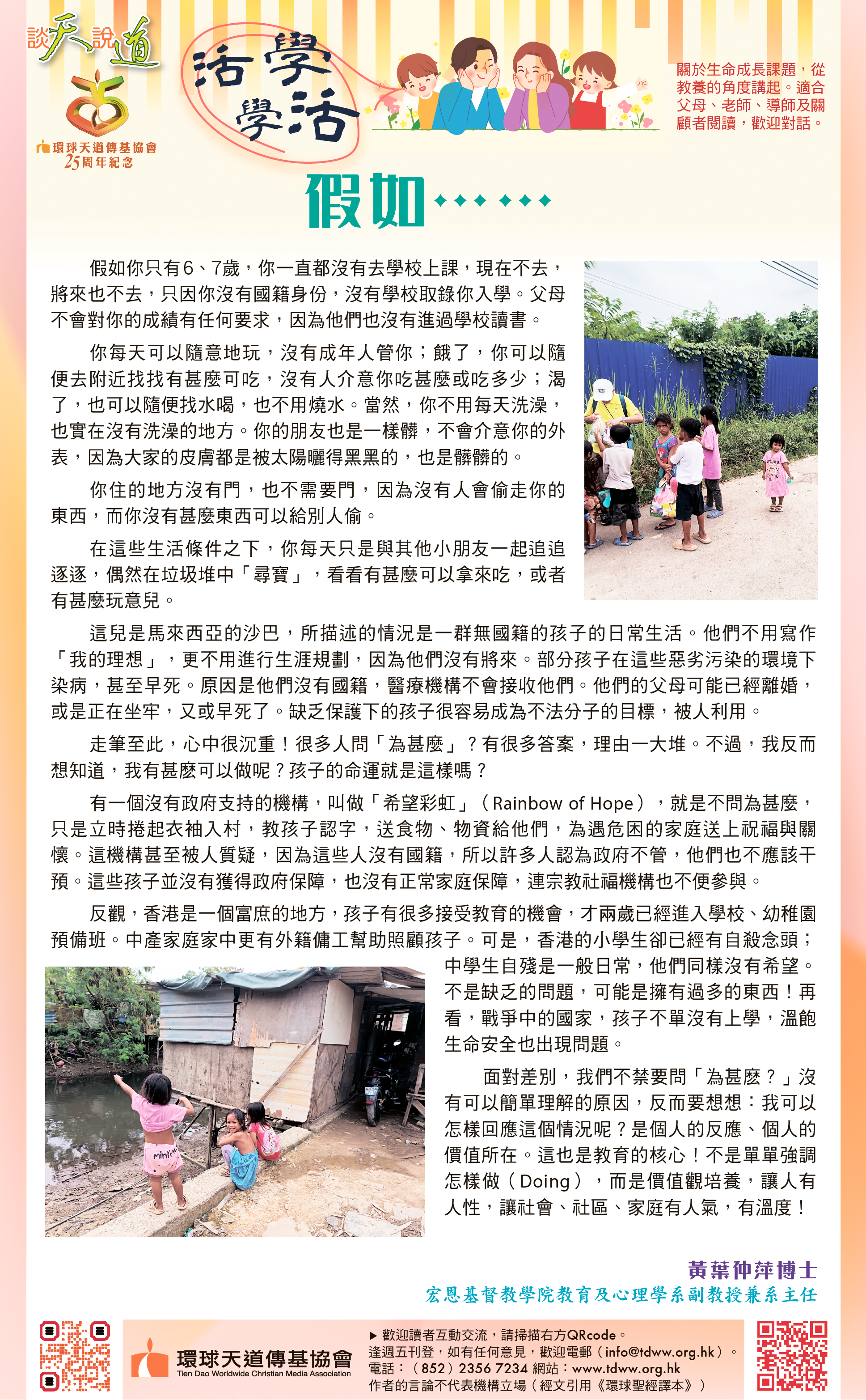 有一個沒有政府支持的機構,叫做「希望彩虹」(Rainbow of Hope),就是不問為甚麼,只是立時捲起衣袖入村,教孩子認字,送食物、物資給他們,為遇危困的家庭送上祝福與關懷。這機構甚至被人質疑,因為這些人沒有國籍,所以許多人認為政府不管,他們也不應該干預。這些孩子並沒有獲得政府保障,也沒有正常家庭保障,連宗教社福機構也不便參與。