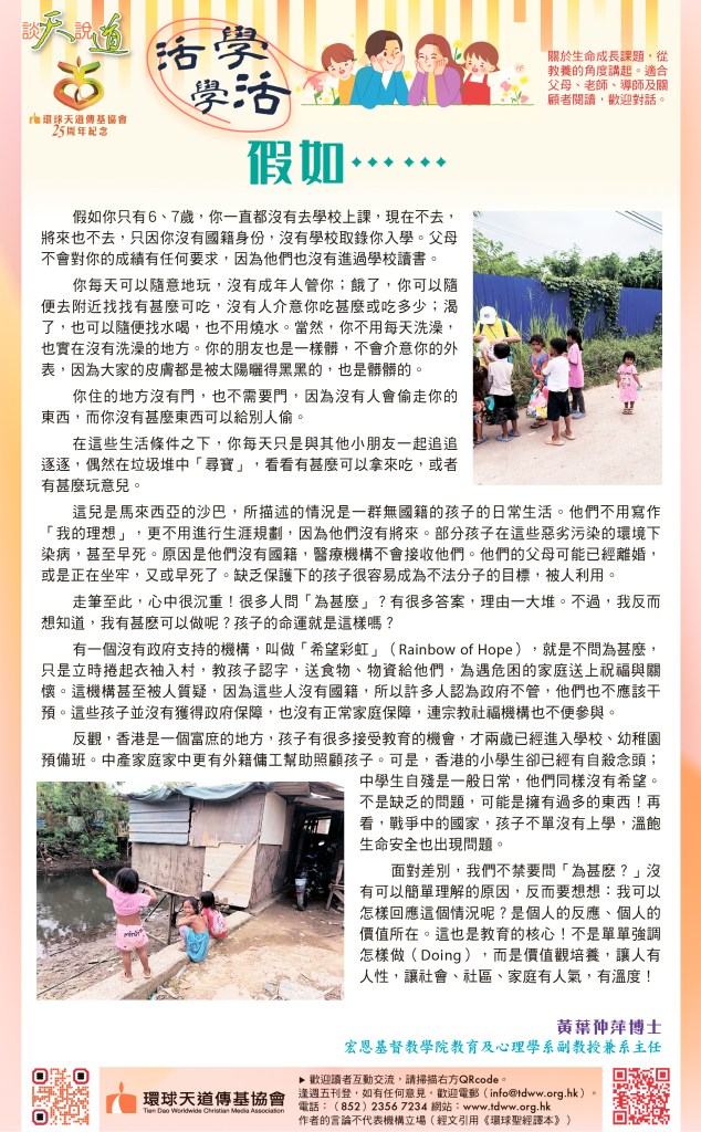 早前,我藉著到馬來西亞教學的便利,去探訪了一個特別的跨國界工作機構。該機構的名字叫“Rainbow of Hope”,是一個人道救援組織。他們的工作很實在,但卻是十分之低調。因為他們服侍的對象是一班沒有國籍的人。這群人為了生活,從附近的菲律賓島嶼偷渡到馬來西亞。雖然有些人已經在馬來西亞出生,甚至生活了兩、三代人了;但是因為沒有國籍身份,只能夠躲躲藏藏地生活,沒有機會接受教育,完全缺乏醫療幫助。他們沒有重要的法律保護,得到很少援助,甚至因為他們沒有合法的身份,連教會也不敢主動參與支援。這些「難民」最終會在非正規部門中過著不穩定的生活,像建築、食品製造工場、家庭傭工、餐廳等,做低收入的黑工;並且經常被扣查,苛索金錢,受到剝削和欺負。